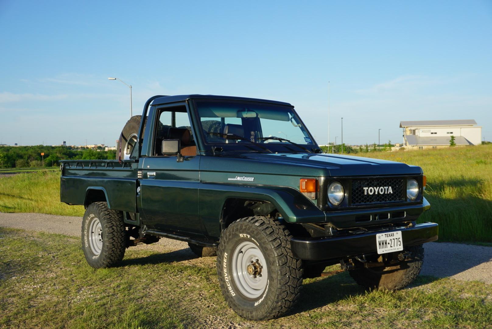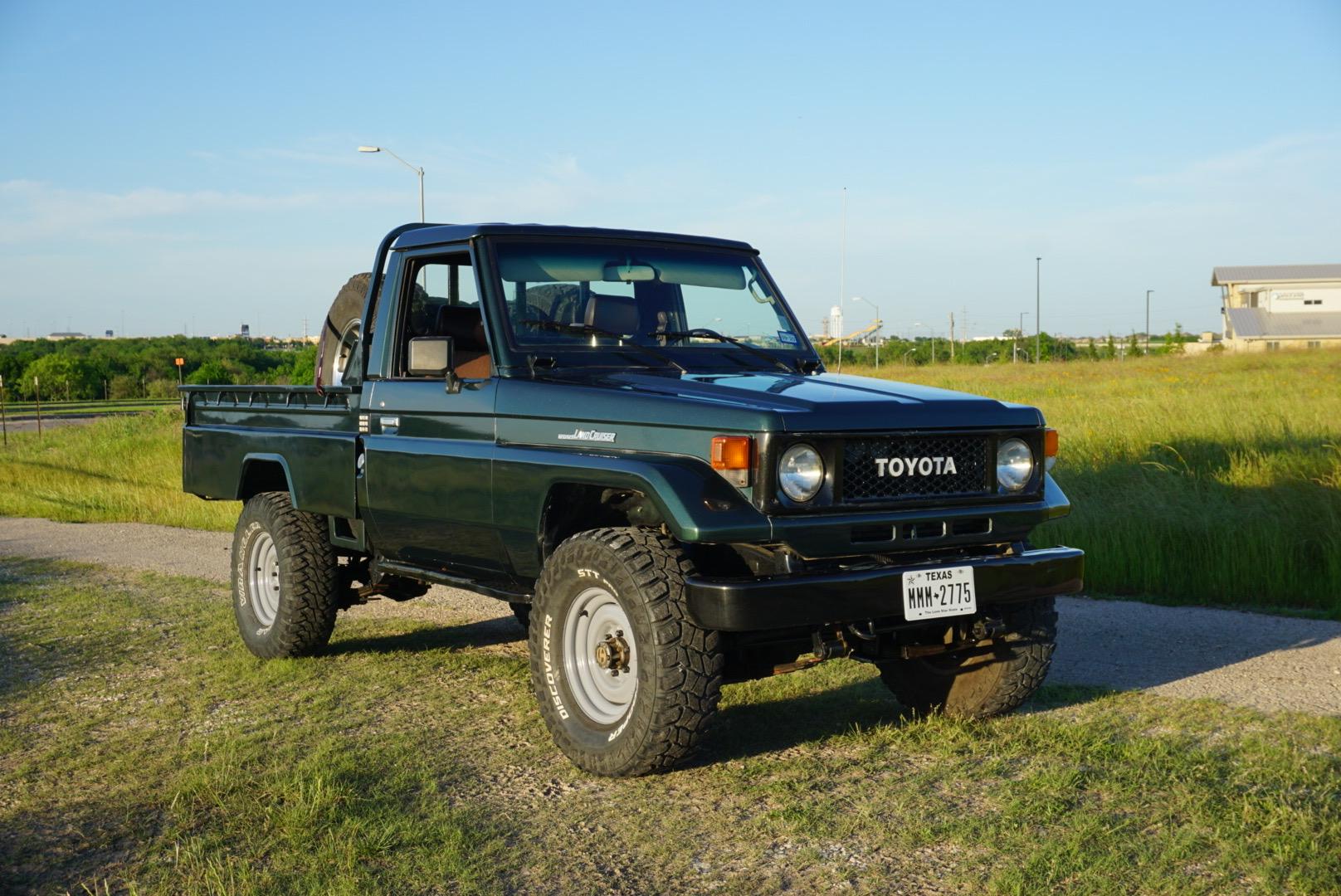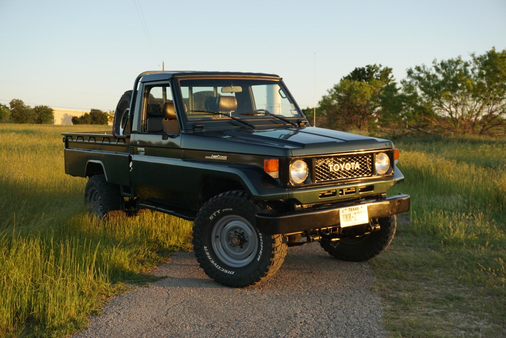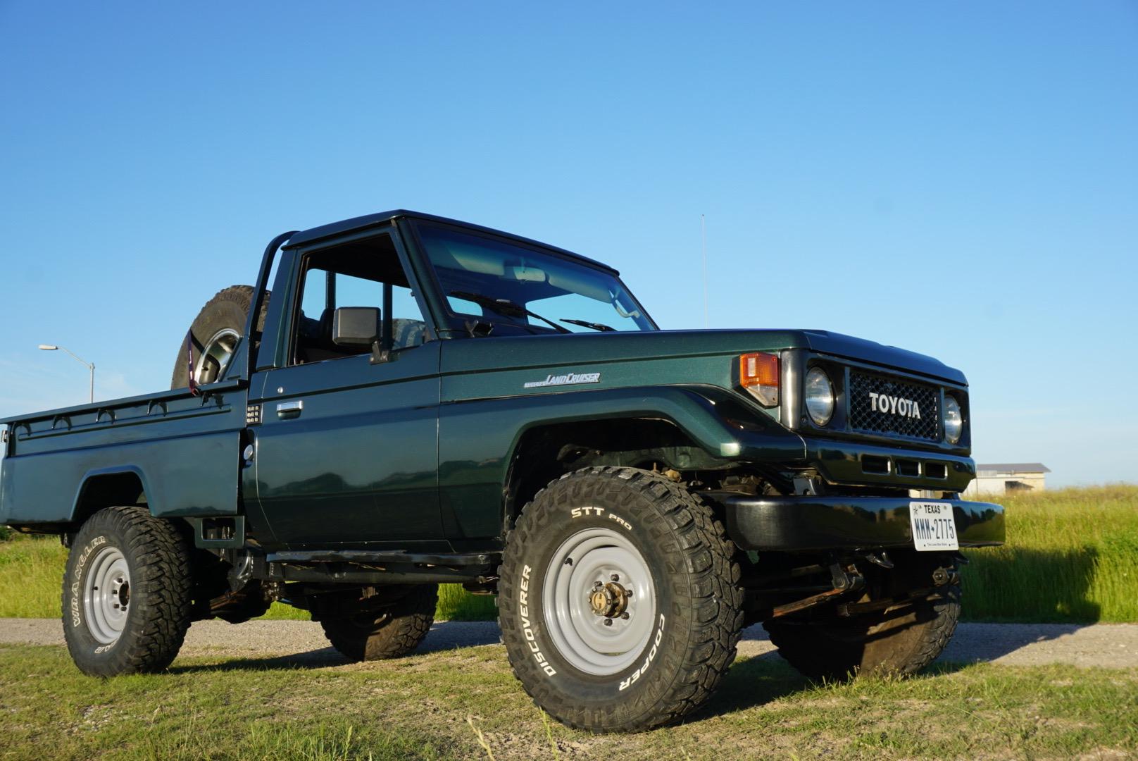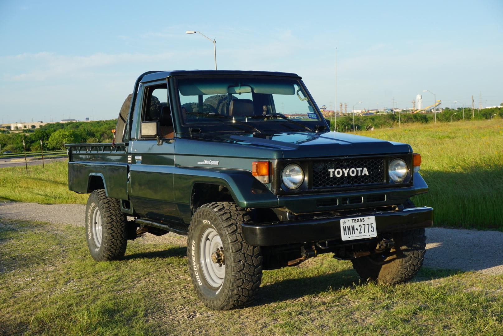Gray 16″ steel wheels wear Cooper Discoverer STT Pro tires and mounted over manually-locking Aisin hubs up front. A spare is located under the bed. The sale also includes a set of Toyota alloy wheels with older mud tires.