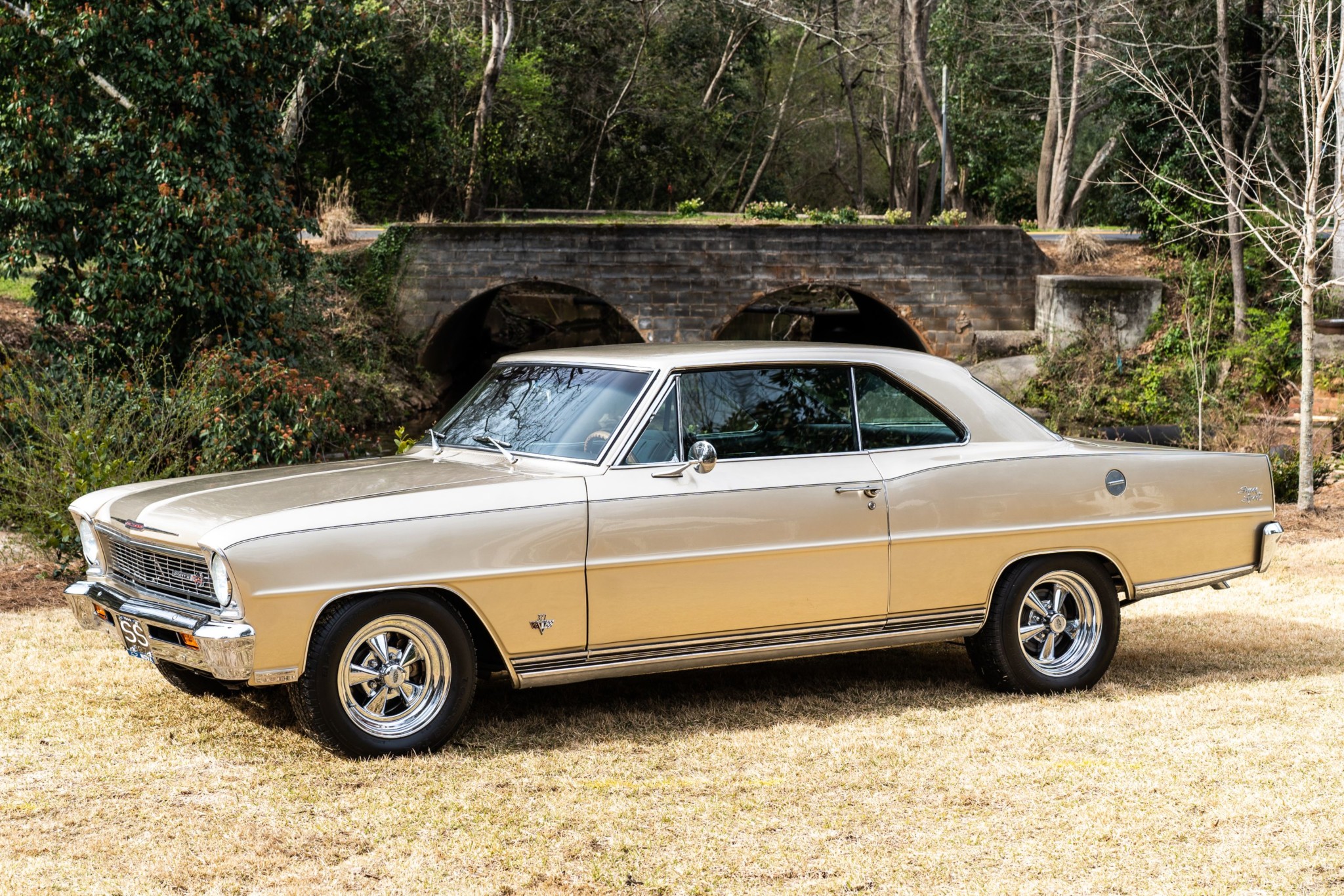 Chrome-finished 15″ Cragar S/S wheels wear BFGoodrich Radial T/A tires. Front disc brakes are paired with drums at the rear. The upper and lower ball joints were replaced and the steering arms adjusted in January 2020.