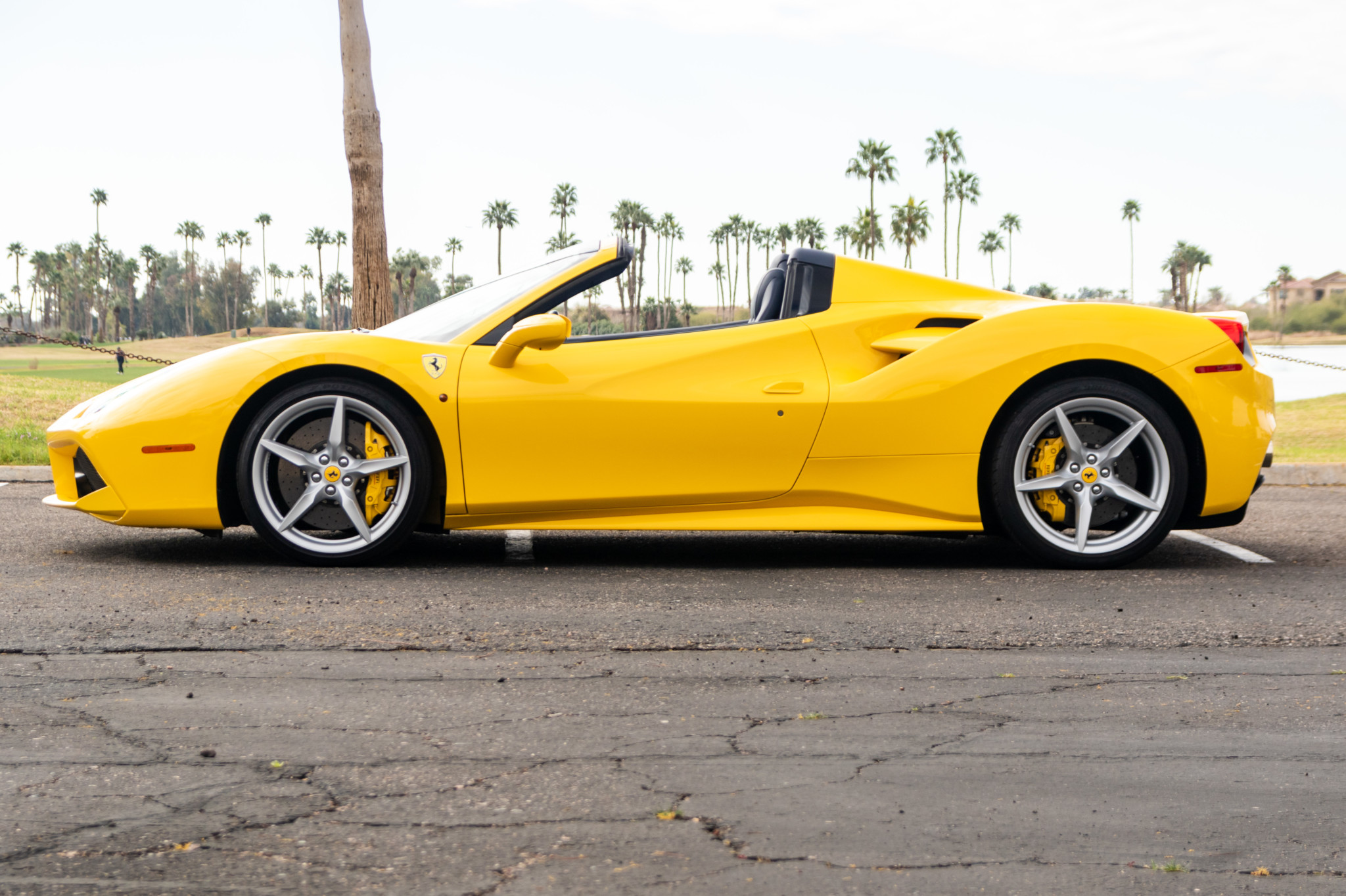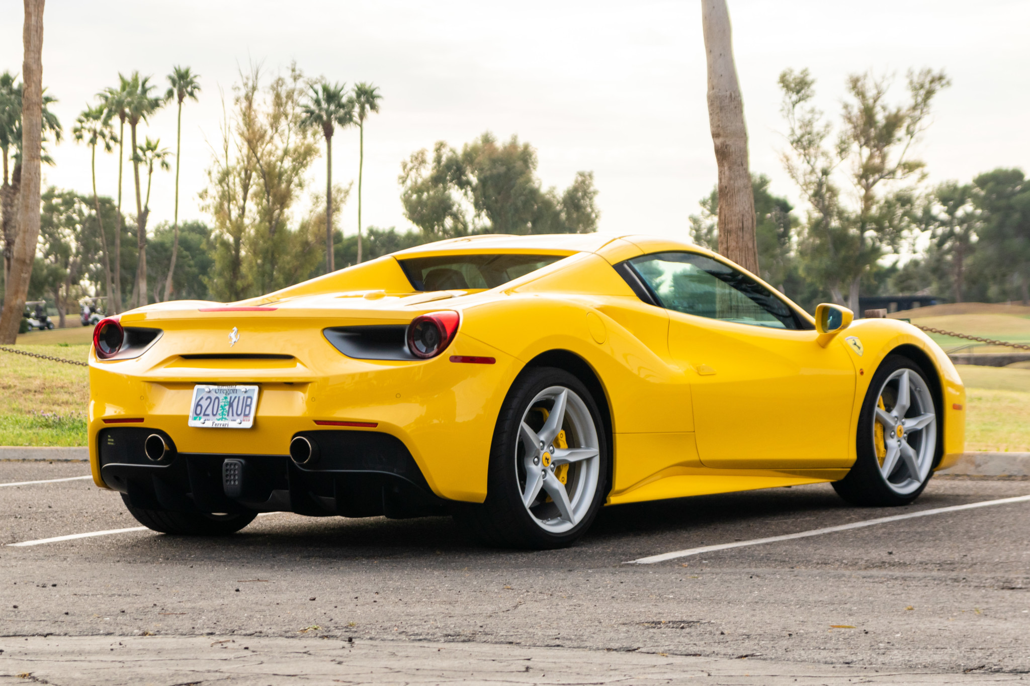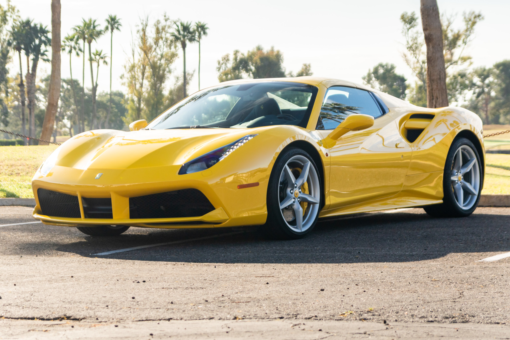 Factory 20″ five-spoke wheels are mounted with Bridgestone Potenza S007 tires measuring 245/35 up front and 305/30 out back. Carbon ceramic brakes came as standard, and this example is also equipped with optional yellow-finished brake calipers, magnetorheological dampers, slide slip control, and a double wishbone front and multi-link rear suspension.