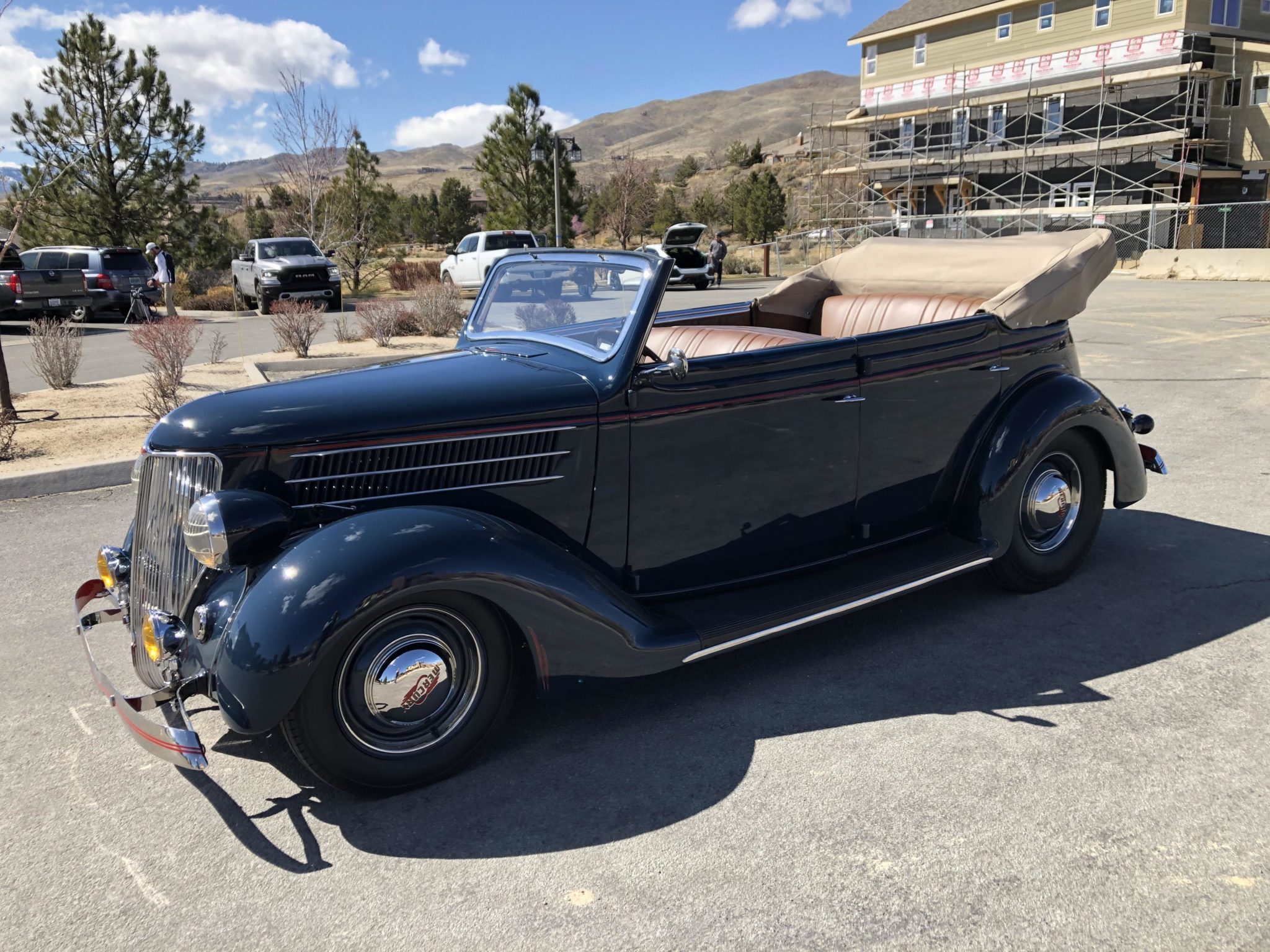 The chassis features a Super Bell dropped front axle with a split wishbone and a Hot Rod Works rear axle conversion, along with drum brakes all around and Pro Shocks SM-Series chrome shock absorbers at the rear. Ford 16″ steel wheels are color-keyed to the body and fitted with early Mercury-branded chrome hubcaps, trim rings, and Coker Classic tires mounted by the previous owner. The factory steering assembly is said to have been rebuilt.