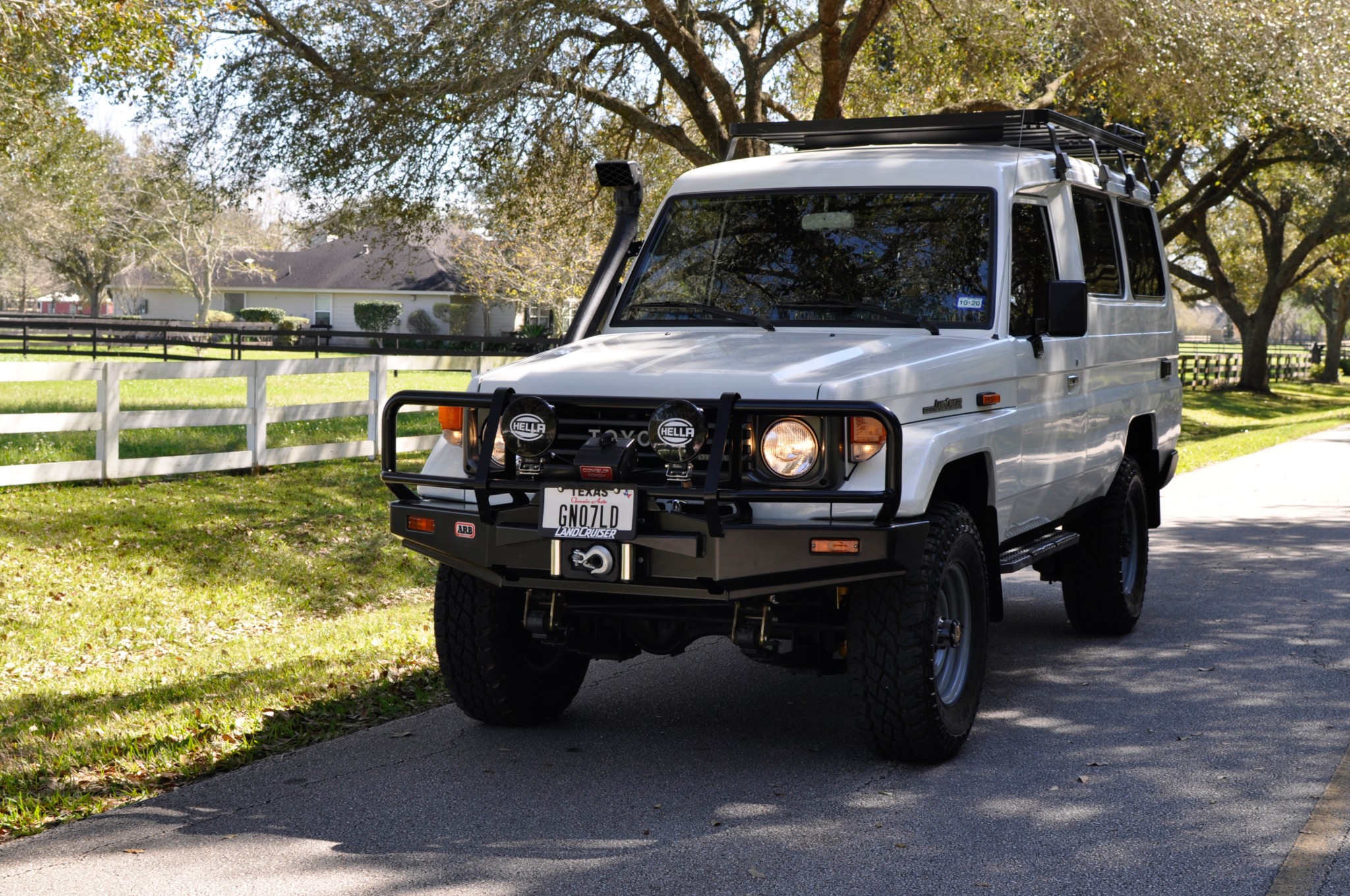 Additional equipment includes a snorkel, a Front Runner roof rack and rear ladder, and side steps. Gray steel 16″ NATO wheels custom made by Stockton Wheel Service wear 255/85 Cooper Discoverer S/T Maxx tires, and a matching spare is mounted under a vinyl cover at the rear. Free-wheeling Aisin front hubs have been installed along with Old Man Emu suspension components. A list from the seller showing parts replaced or added can be found in the gallery.