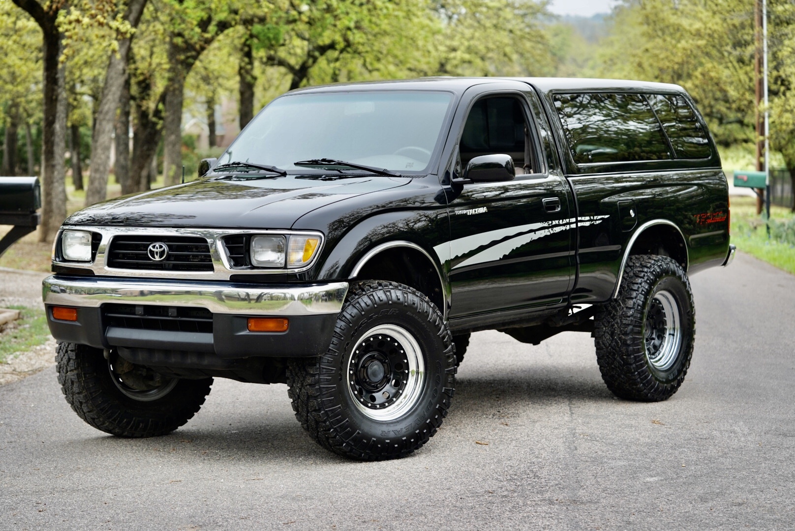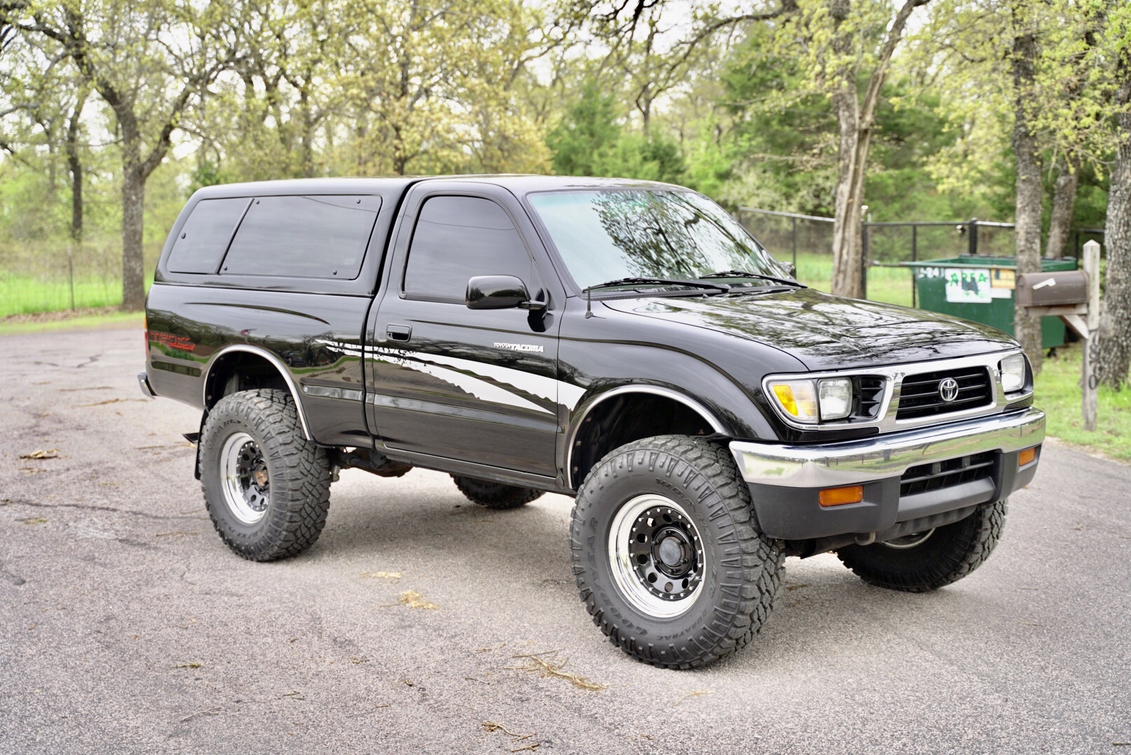16″ wheels feature a polished lip and wear 285/75 Goodyear Wrangler DuraTrac tires recently installed by the seller. The suspension is said to be modified with Bilstein 5100 adjustable shocks and replacement springs, and additional work performed included replacement of the ball joints, bushings, and brakes. The seller states that the emergency brake needs adjustment.