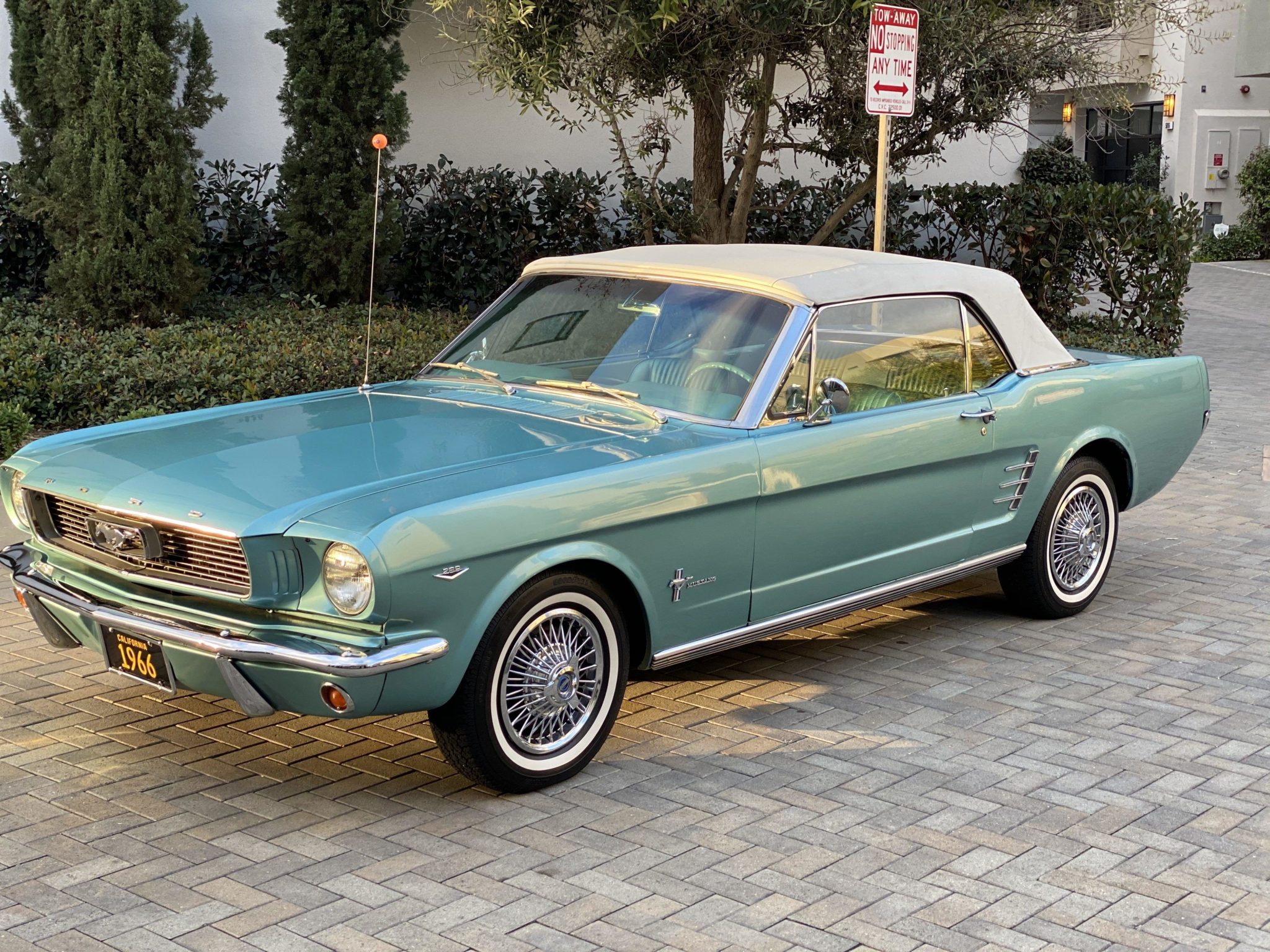 14″ wheels feature wire covers with simulated knock-offs and wear 195/75 Goodyear Arriva whitewall tires. Service performed by the seller is said to include replacement of the tires, power steering components, and cross-drilled front disc brakes.