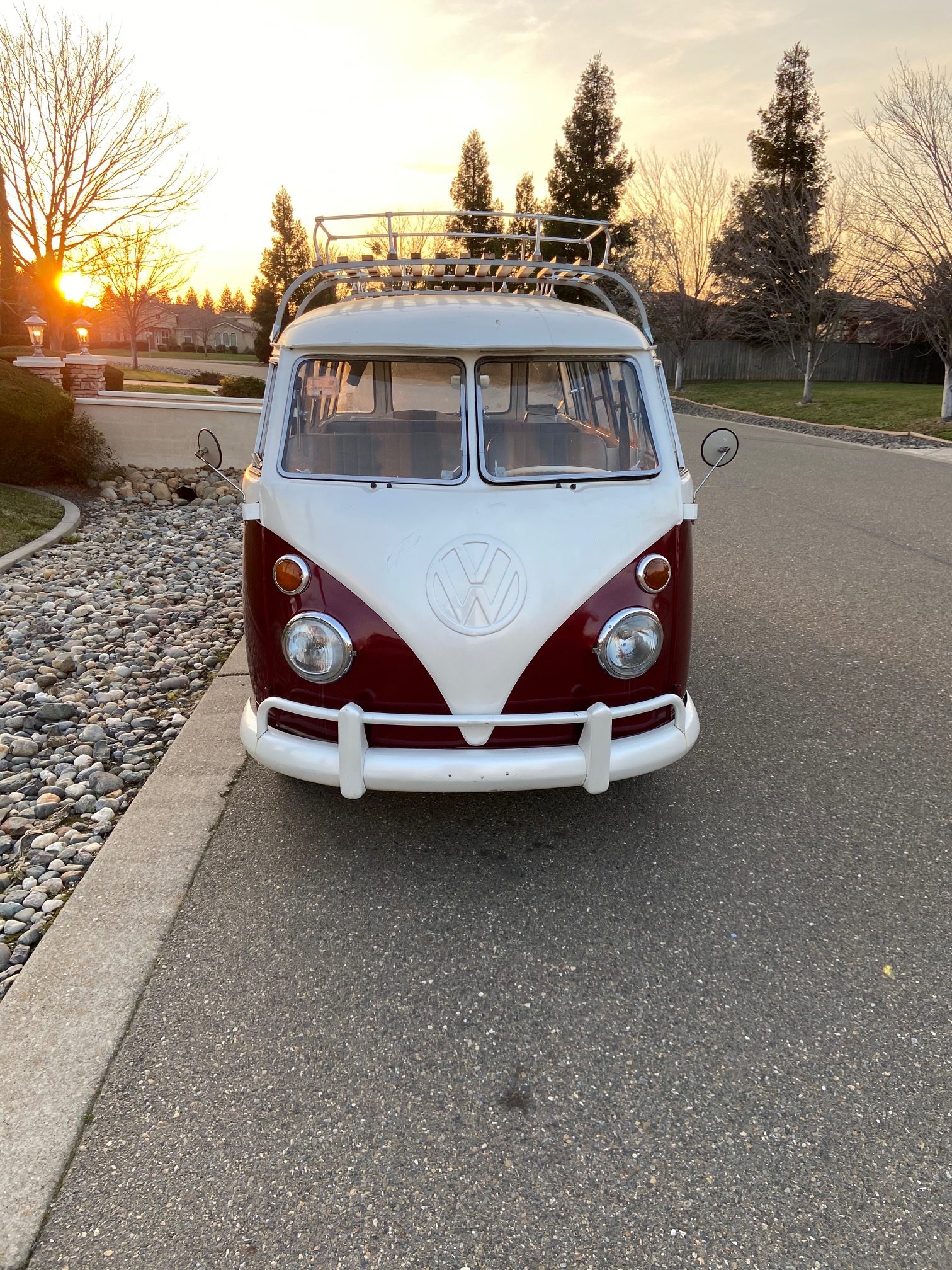 Accessories include dual roof baskets with wood slats, front corner guards, and dual rearview mirrors. Safari windshield panels open at their bases for ventilation, while the front door glass slides open and the hinged side windows pop out. The front wing windows, new rubber window seals, and a roof ladder are included in the sale. White 15″ steel wheels wear chrome hubcaps and Pirelli tires.