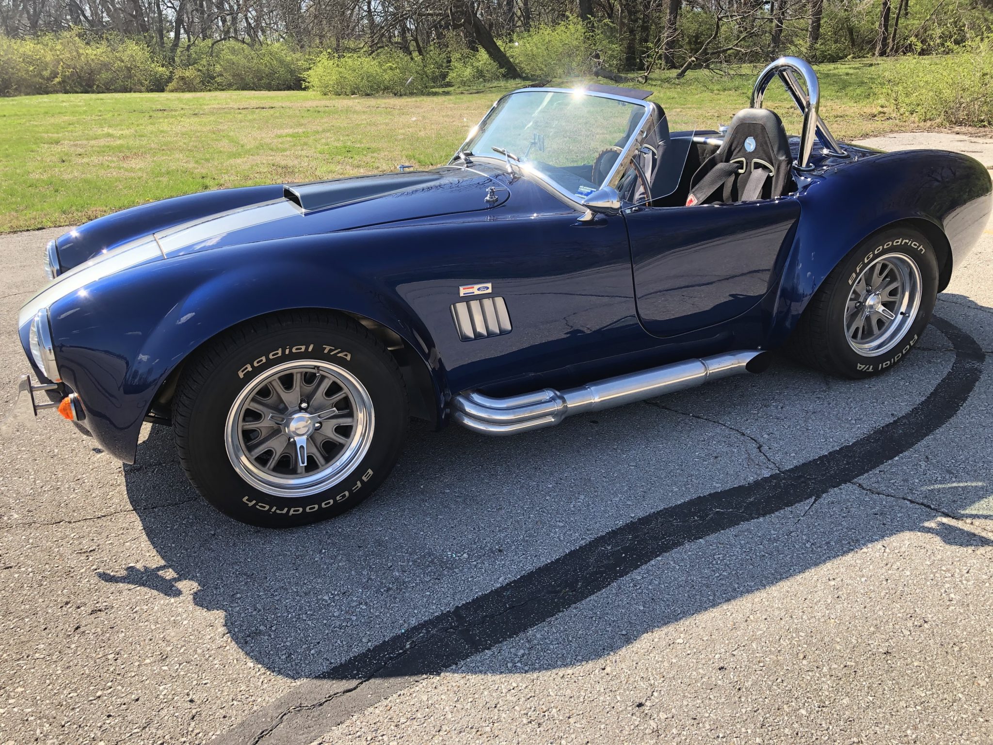 Additional equipment includes a chrome roll hoop, chrome quick-jack points, and wind wings. Four-lug 15″ Halibrand-style wheels measure 12″ wide out back and 8″ up front, and are shod in BFGoodrich Radial T/A white-letter tires. Running gear consists of suspension components from a 1990 Ford Mustang, a three-link rear end with coilovers, and a steering rack with aluminum bushings sourced from Whitby Motorcars.