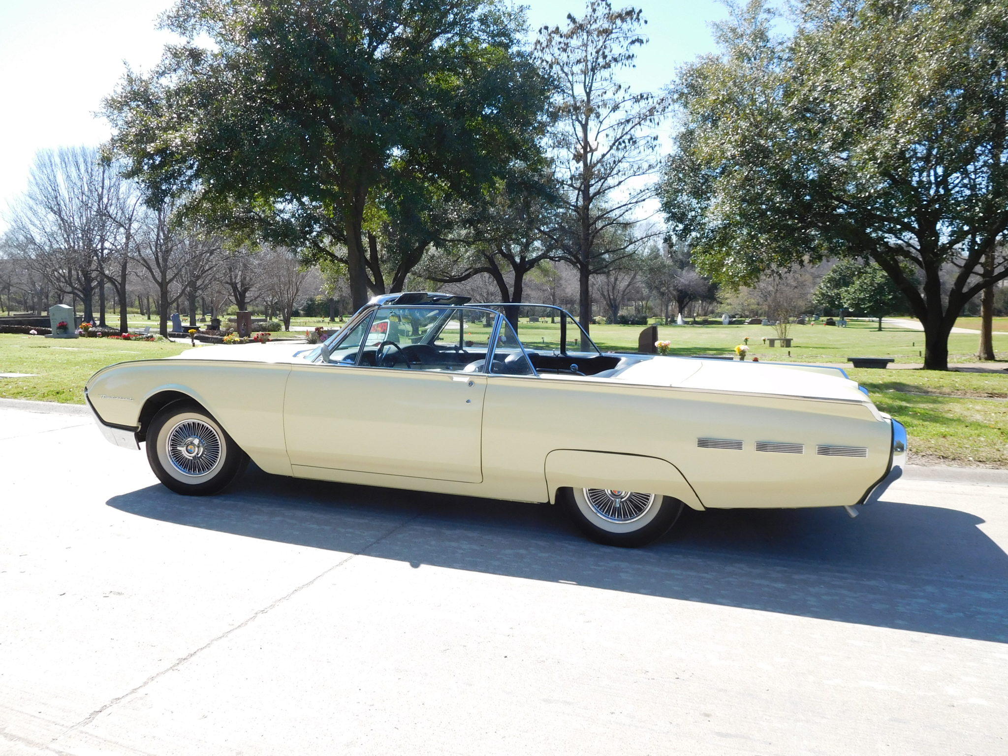 The 14” wheels wear wire covers with faux-knock offs and are mounted with Coker Classic wide whitewall tires. Service to the brakes performed during current ownership is said to have included replacing the booster, master cylinder, brake drums, shoes, wheel cylinders.