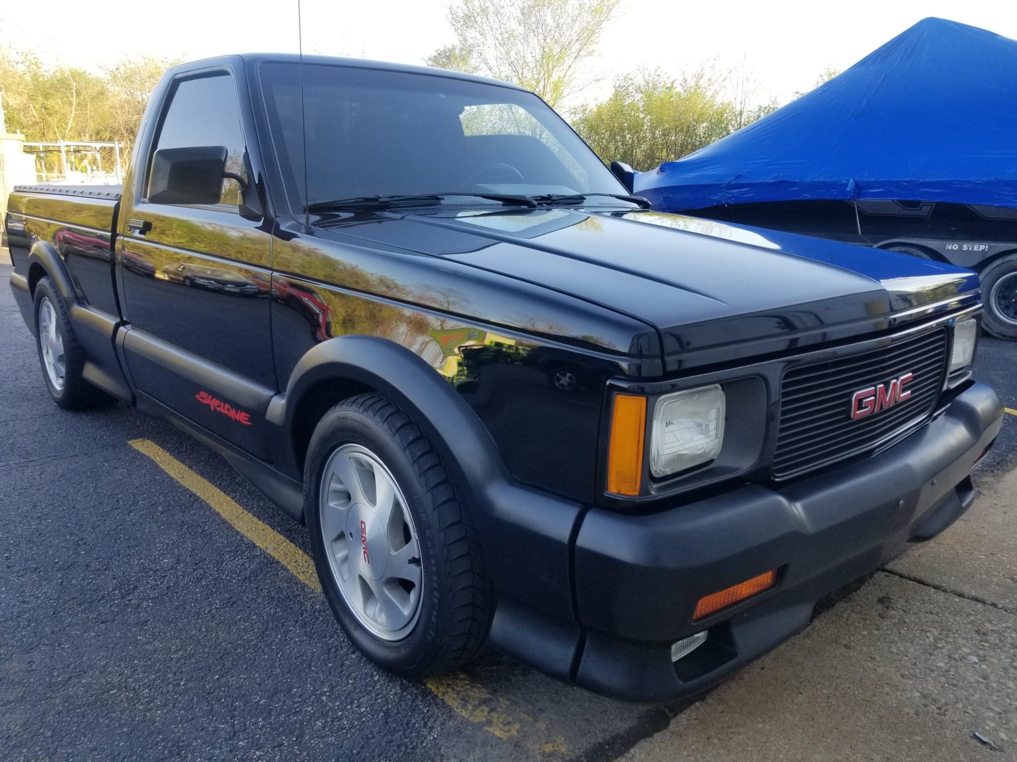 Stock 16″ wheels are wrapped in 245/50 BFGoodrich g-Force Sport COMP-2 tires. A steel spare wearing a Firestone tire is mounted under the bed. A black vinyl snap-on tonneau cover has been added, and the side and rear windows are tinted.