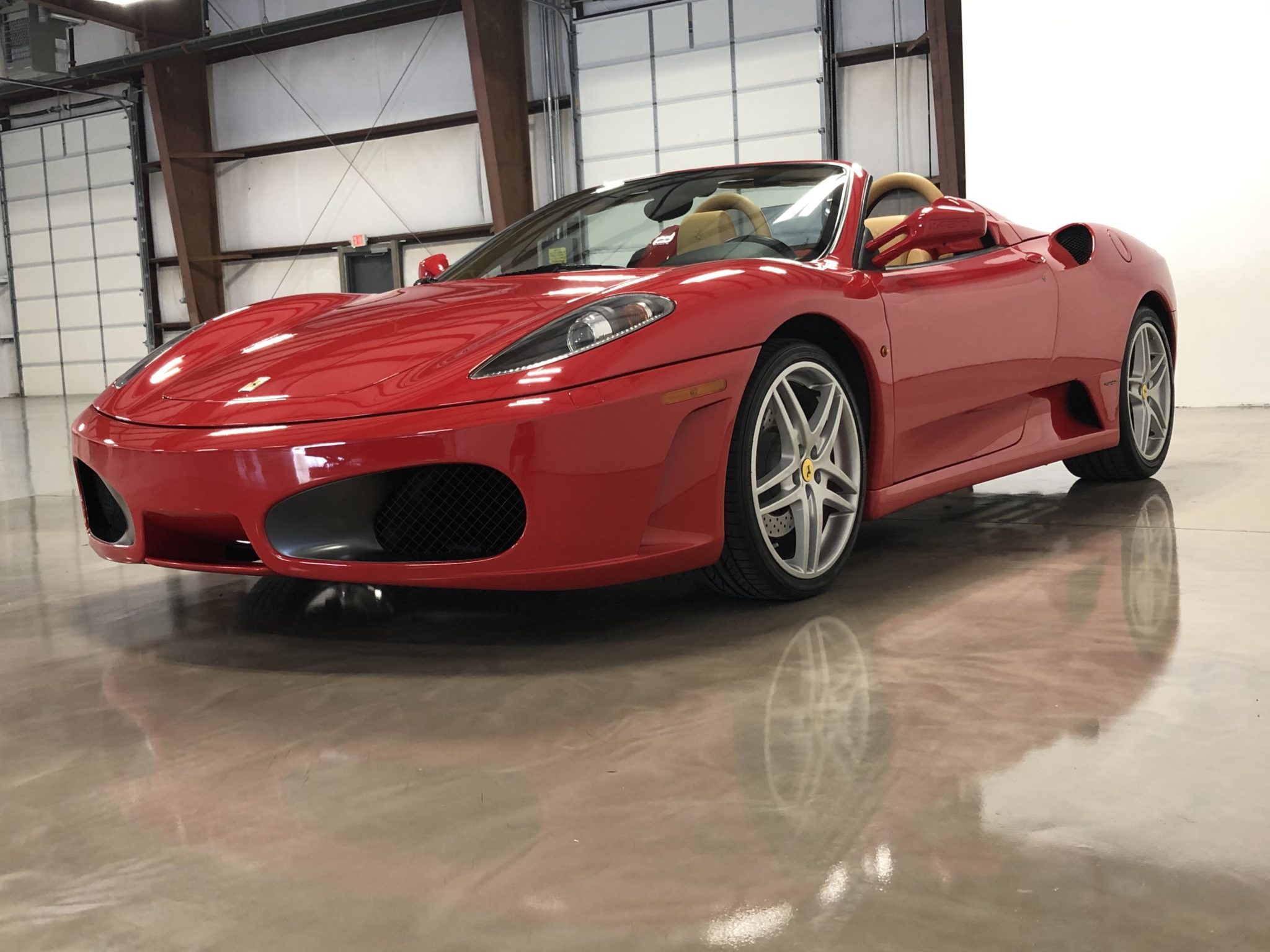 Factory 19″ split-spoke wheels are wrapped in Bridgestone Potenza RE050A tires that show 2008 date codes. The braking system utilizes optional red-painted calipers with white Ferrari decals as well as drilled and vented rotors all around.