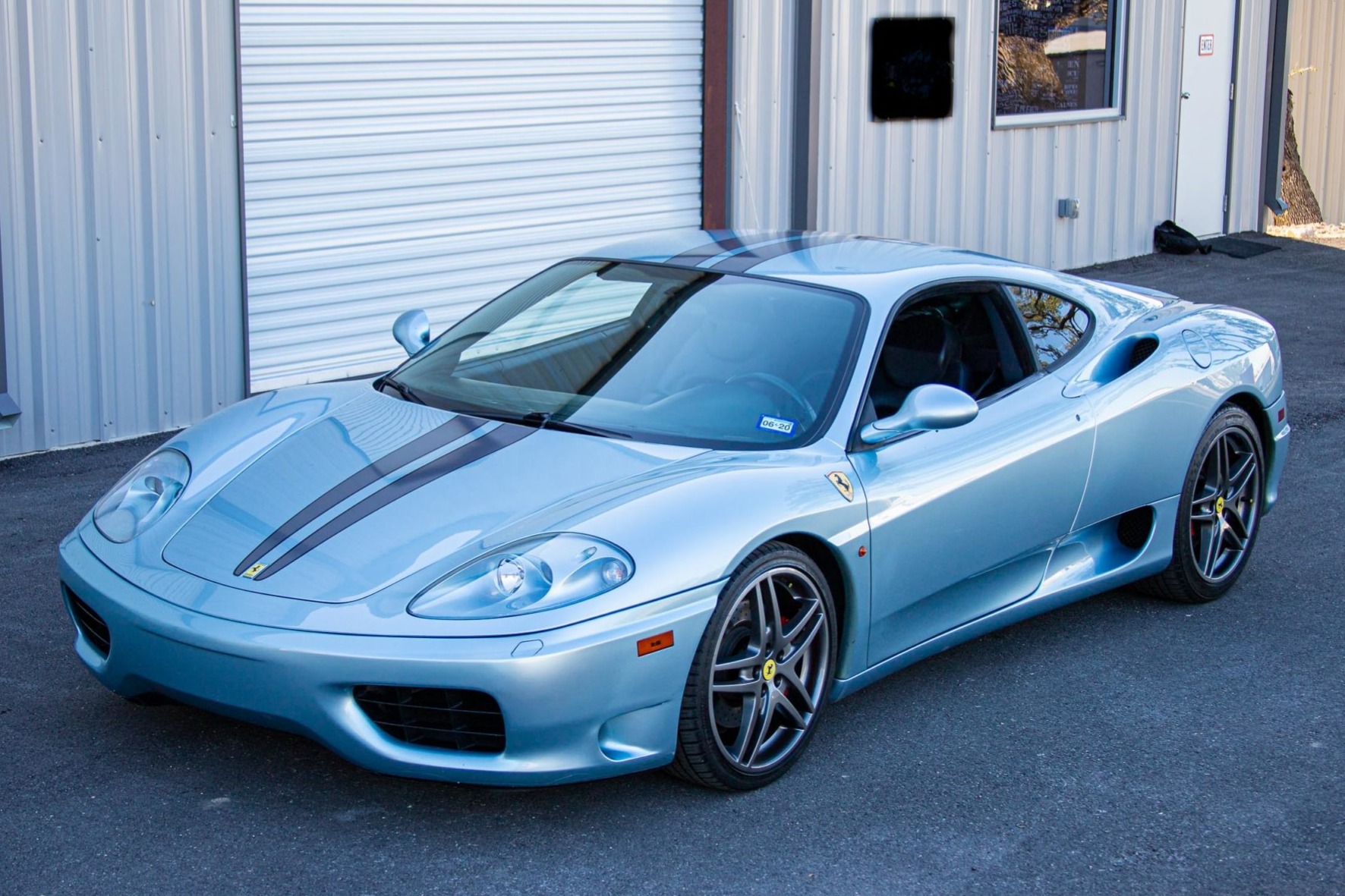 Factory alloys are replaced by 19″ F430 wheels wrapped in Michelin Pilot Sport A/S 3+ tires. Red brake calipers are paired with cross-drilled rotors at each corner, and the seller states a brake service has been performed within the last 500 kilometers.