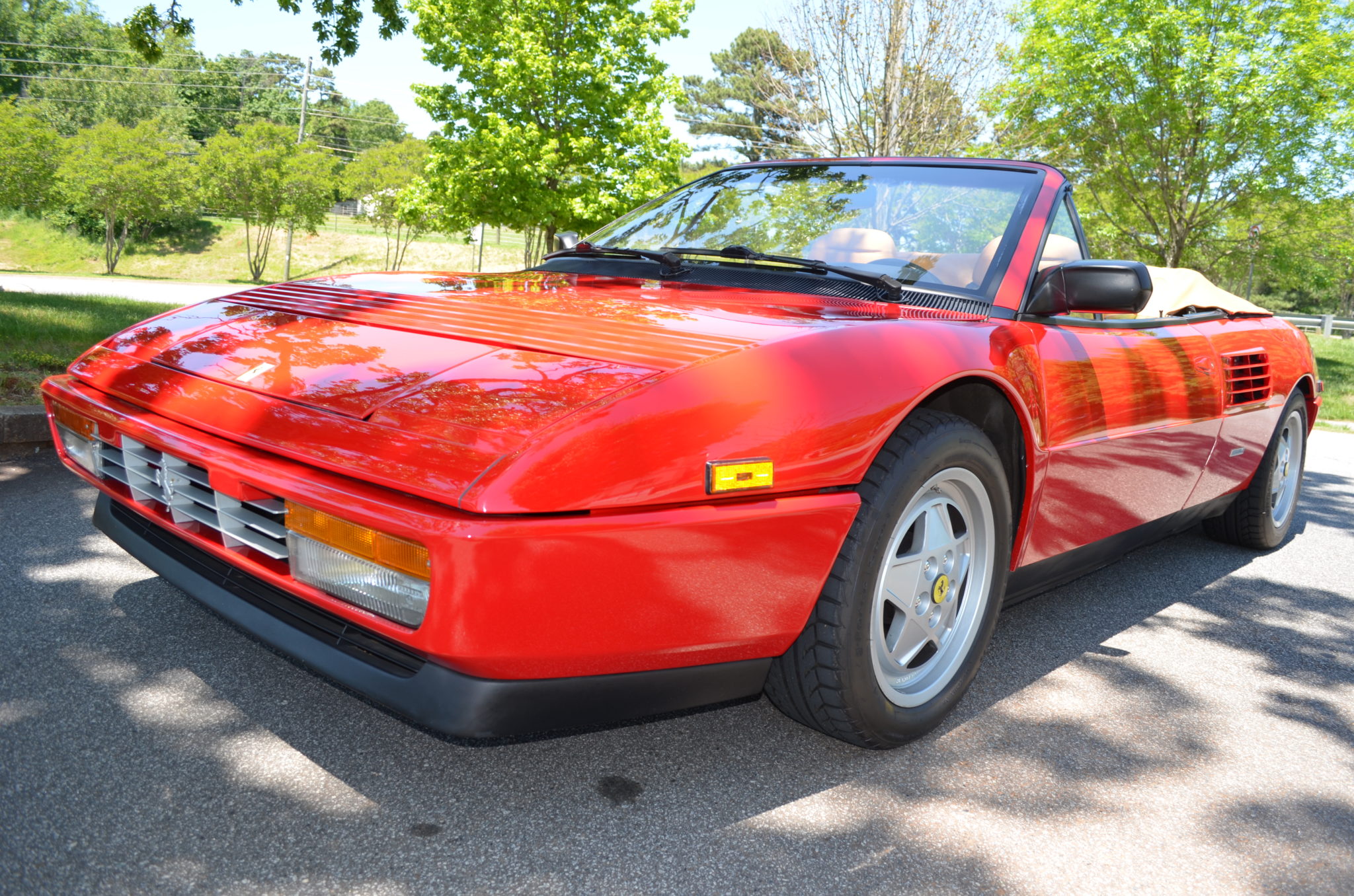 The 16″ five-spoke wheels show Ferrari castings and wear yellow prancing horse center caps as well as staggered-width BFGoodrich g-Force Sport Comp 2 tires. Standard equipment included anti-lock brakes, power steering, and adjustable suspension with two stiffness settings. The included inspection report notes a knock from the suspension when turning left at low speeds, and the brake and power steering fluids have been changed.