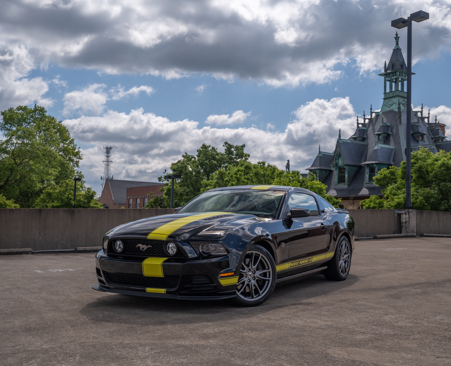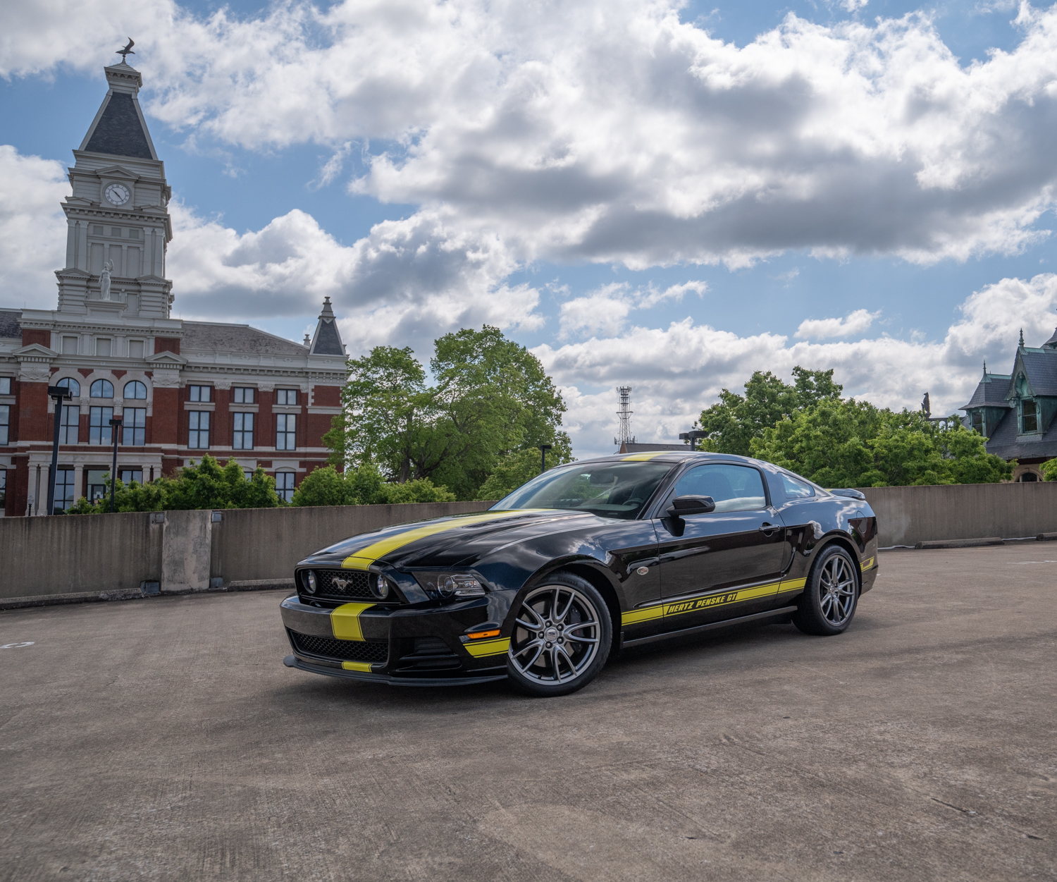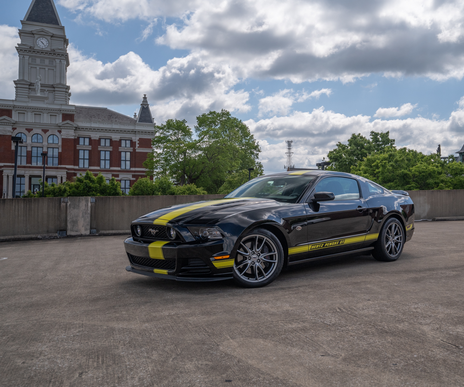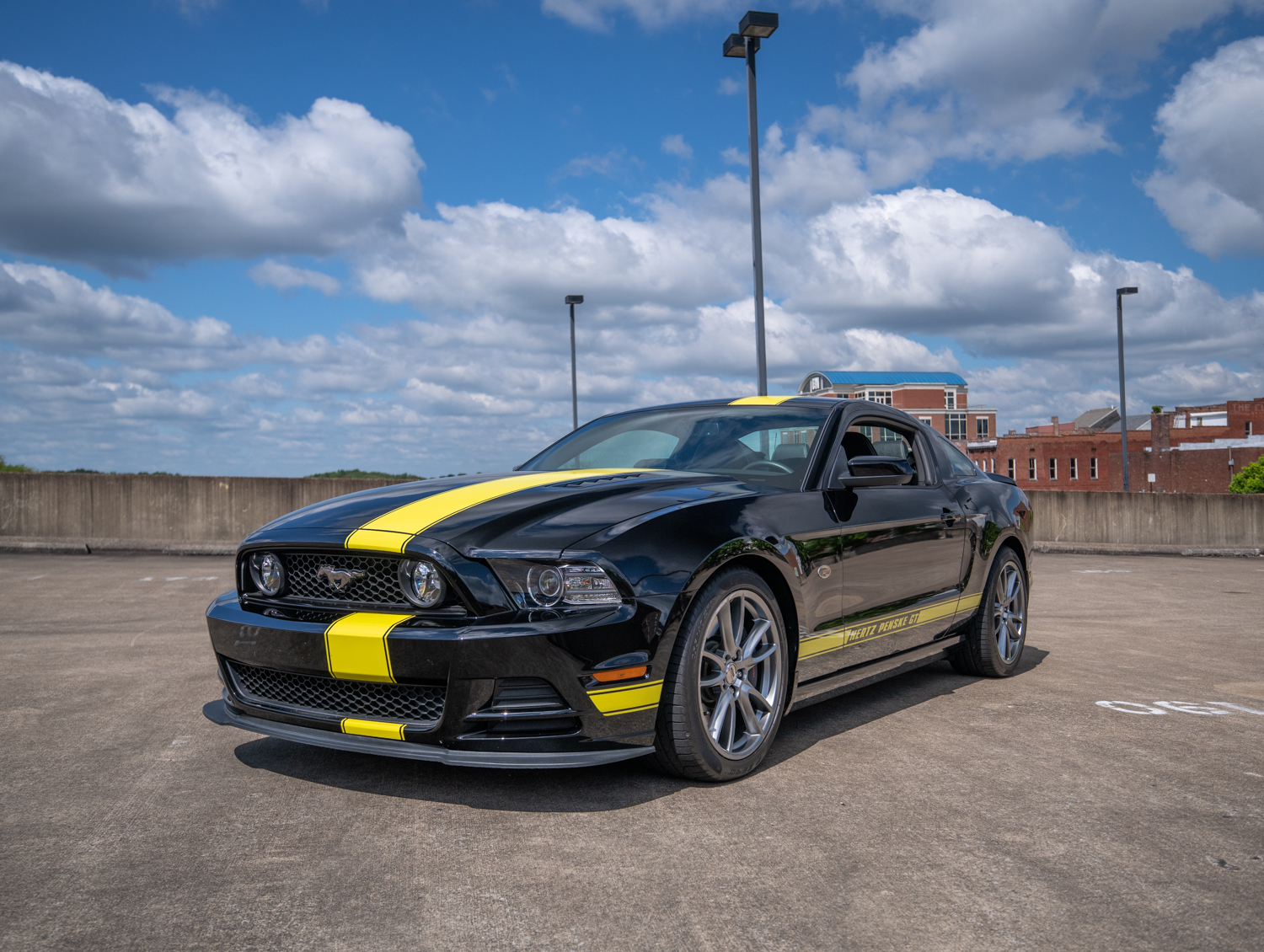 Factory 19″ wheels are mounted with Pirelli PZero tires and Ford Racing center caps. The car is equipped with the optional Brembo brake package, and the Hertz Penske modifications included Ford Racing springs, shocks, and sway bars.