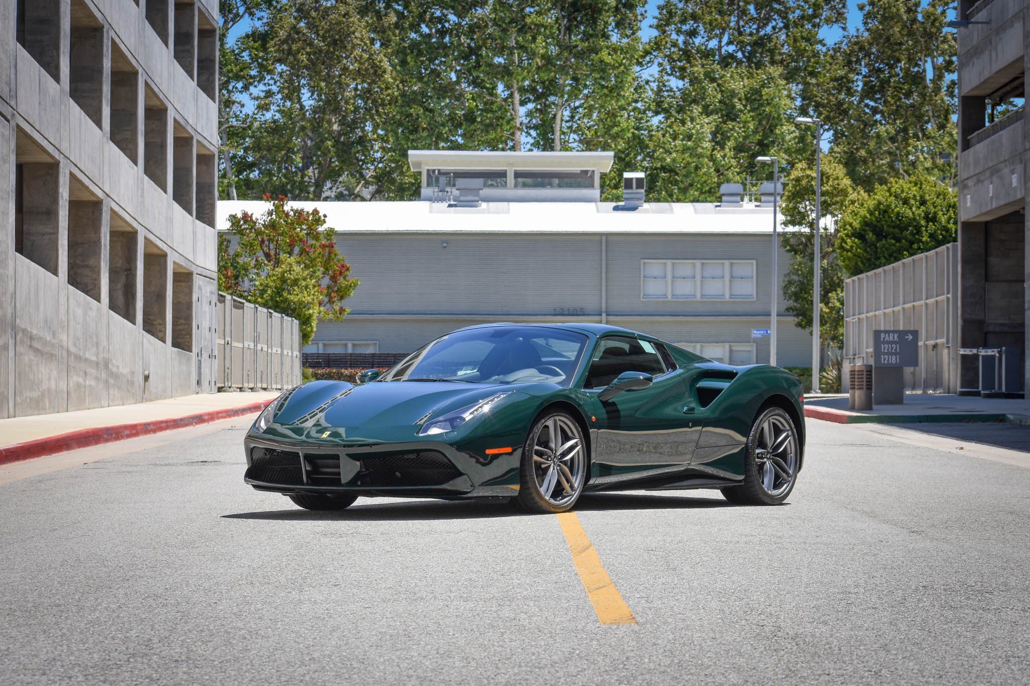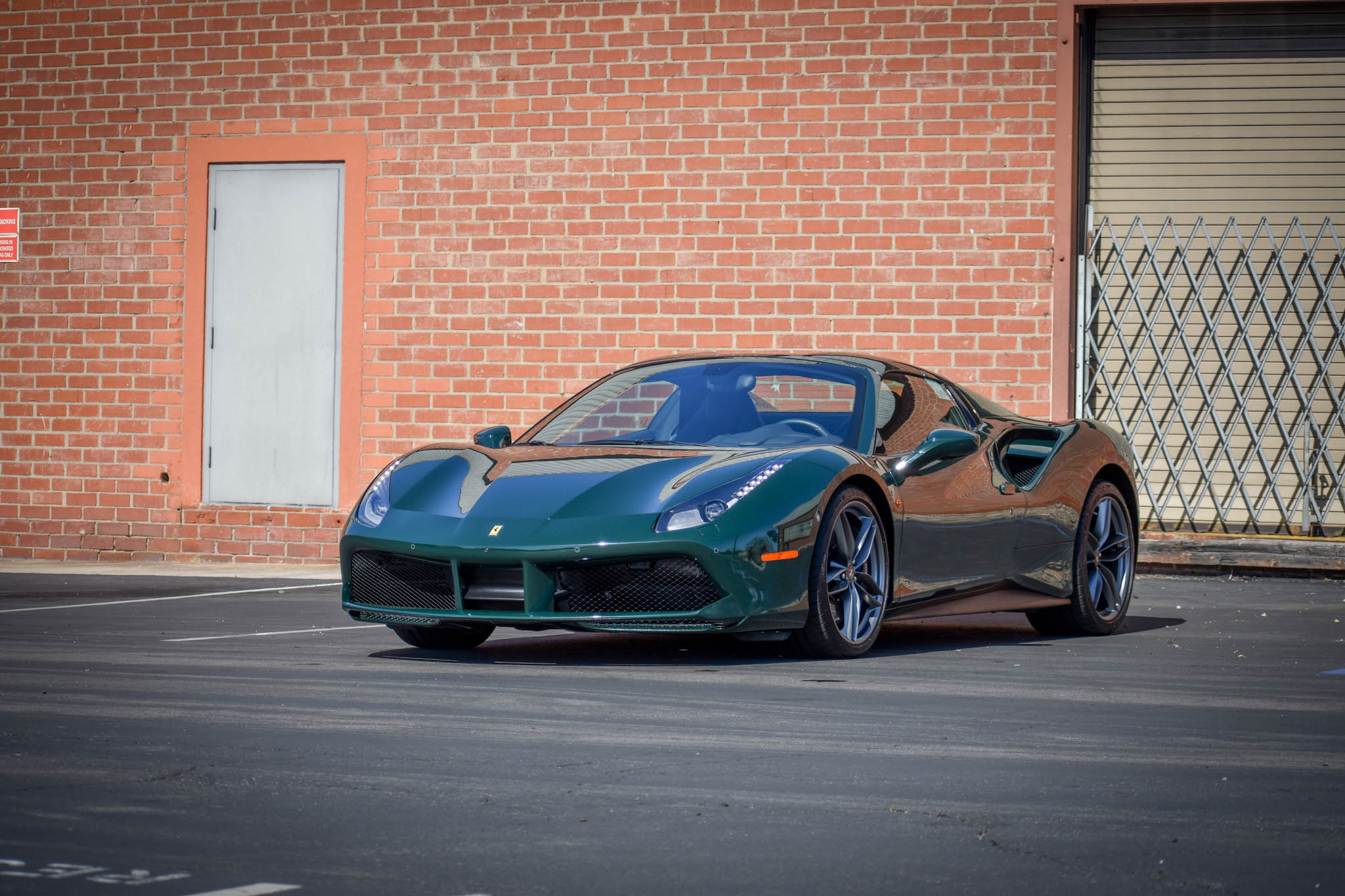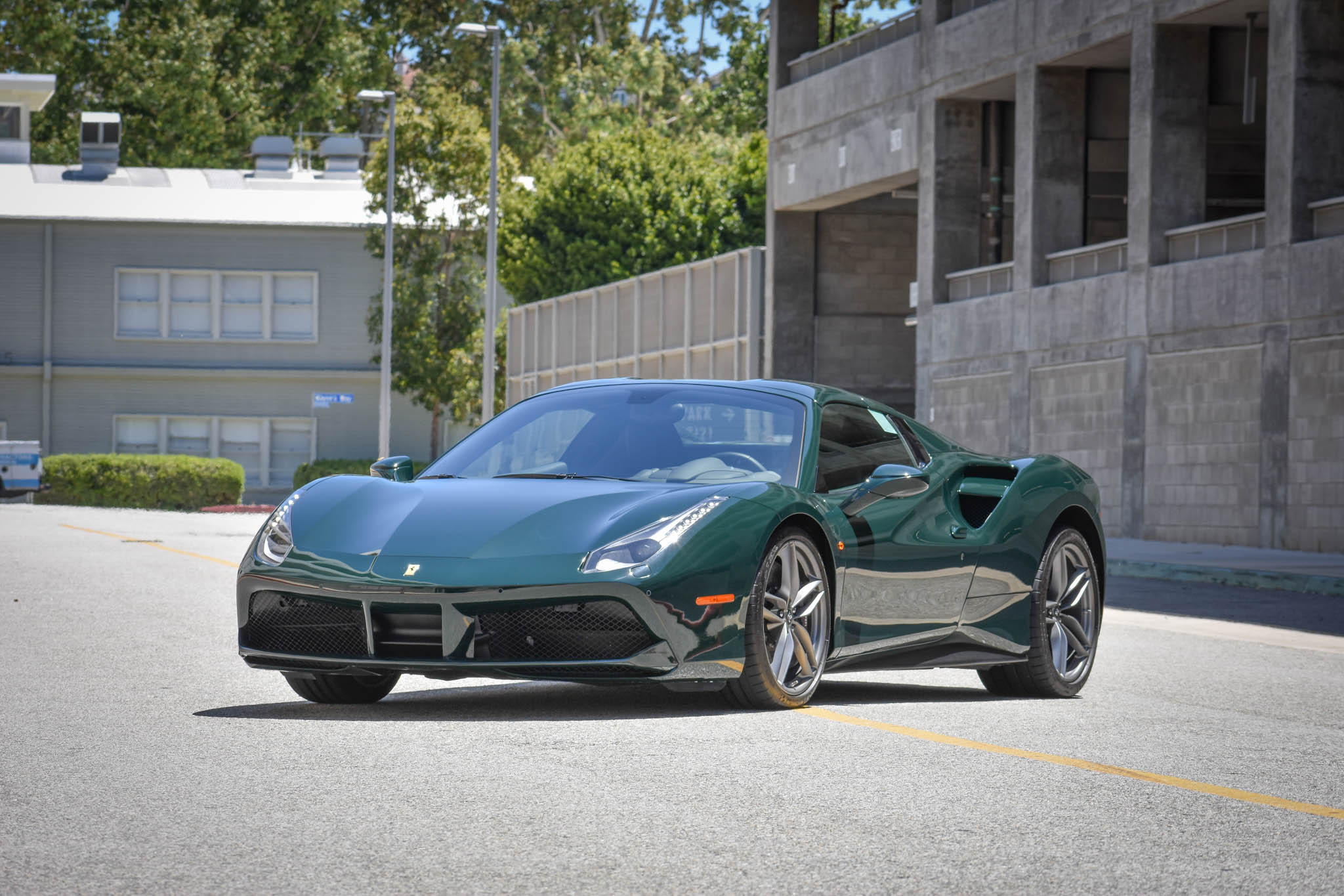 Optional dark-finished 20″ split-spoke wheels are mounted with Michelin Pilot Super Sport tires. Black-finished Brembo calipers are fitted over carbon ceramic rotors, and the car is equipped with adjustable magnetorheological dampers.