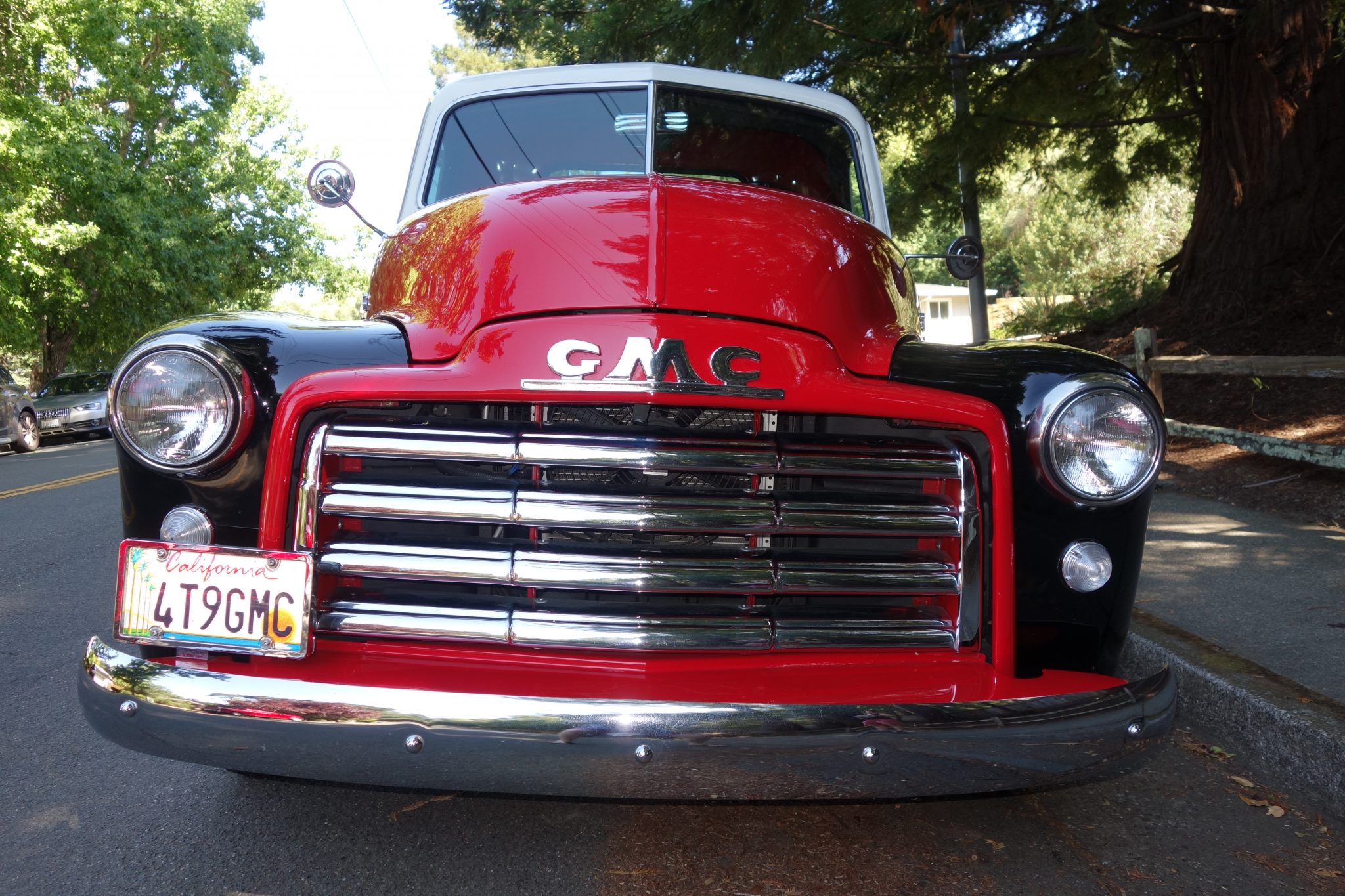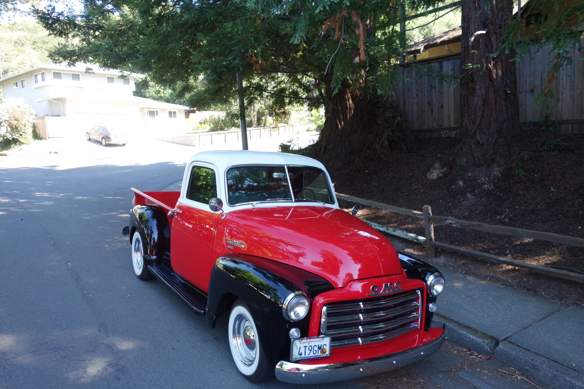 White-painted 15″ steel wheels with chrome GMC-branded hubcaps and trim rings are wrapped in Coker Classic wide-whitewall tires measuring 205/75 in front and 235/75 out back. The suspension has been modified with gas shocks and single leaf springs at each corner.