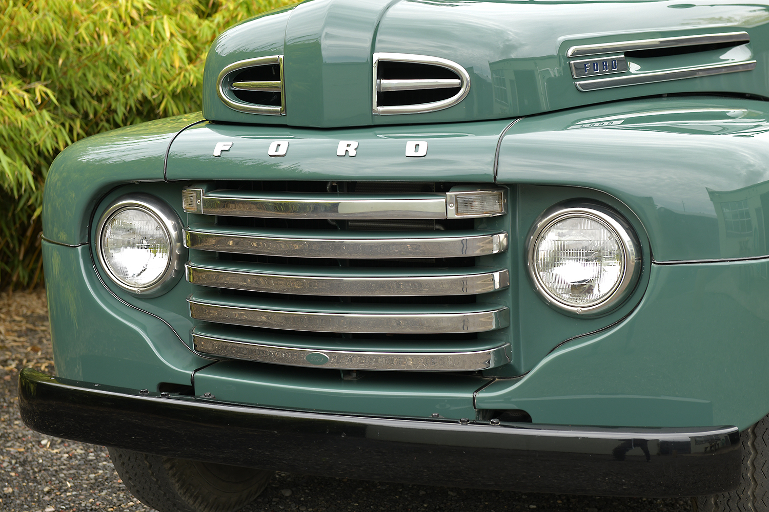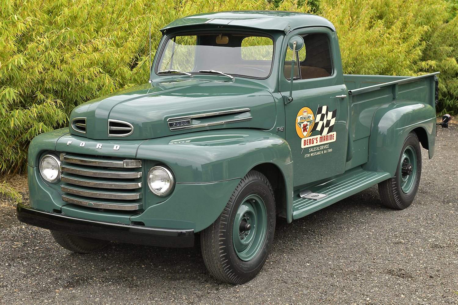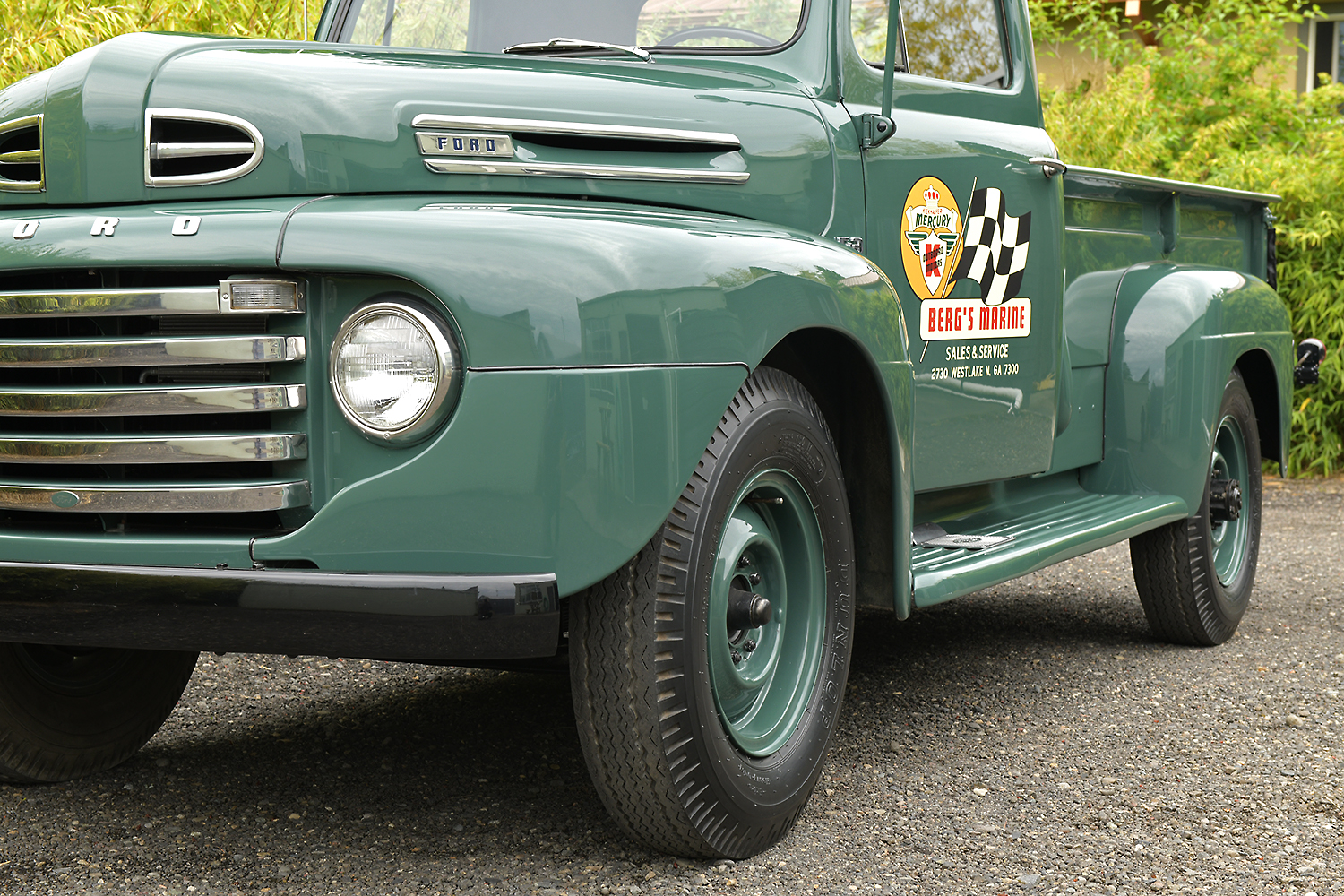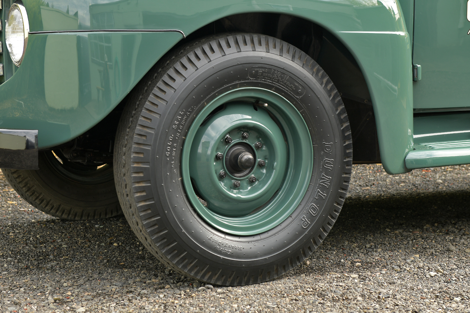 Color-matched 8-lug steel wheels are fitted with 17″ Dunlop Gold Seals tires, including the matching spare mounted under the bed. The oak bed planks have been refinished and fitted with stainless-steel hardware.