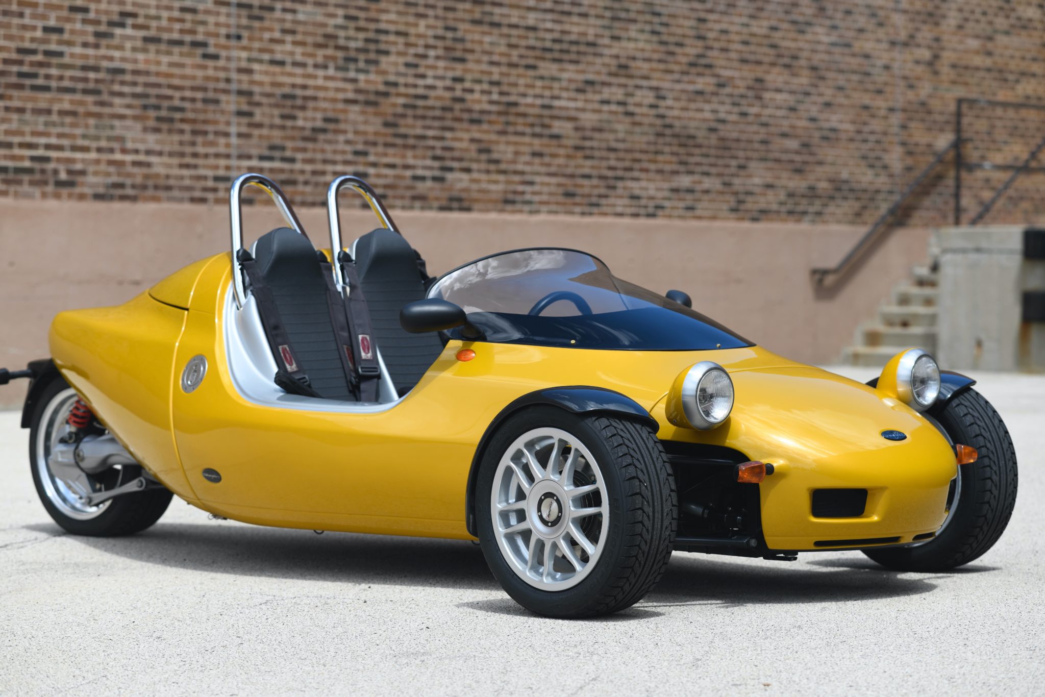 All three wheels wear replacement BFGoodrich G-Force tires measuring 15″ front and 16″ rear. Suspension consists of front A-arms with inboard-mounted shocks and an anti-sway bar, while a single-sided rear swingarm that doubles as the driveshaft enclosure is mounted to a monoshock. Braking is from discs at all three wheels.
