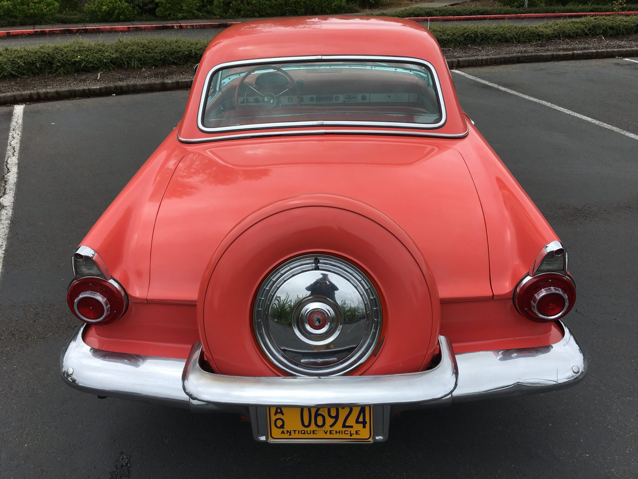 Body-color 15″ steel wheels with chrome wheel covers wear a set of Uniroyal white stripe tires that were mounted in May 2020. The spare tire was moved to the outside of the trunk for the 1956 model year, and braking is provided by four wheel drums. Recent service of the braking system is said to include replacement of the shoes, wheel cylinders, and master cylinder.