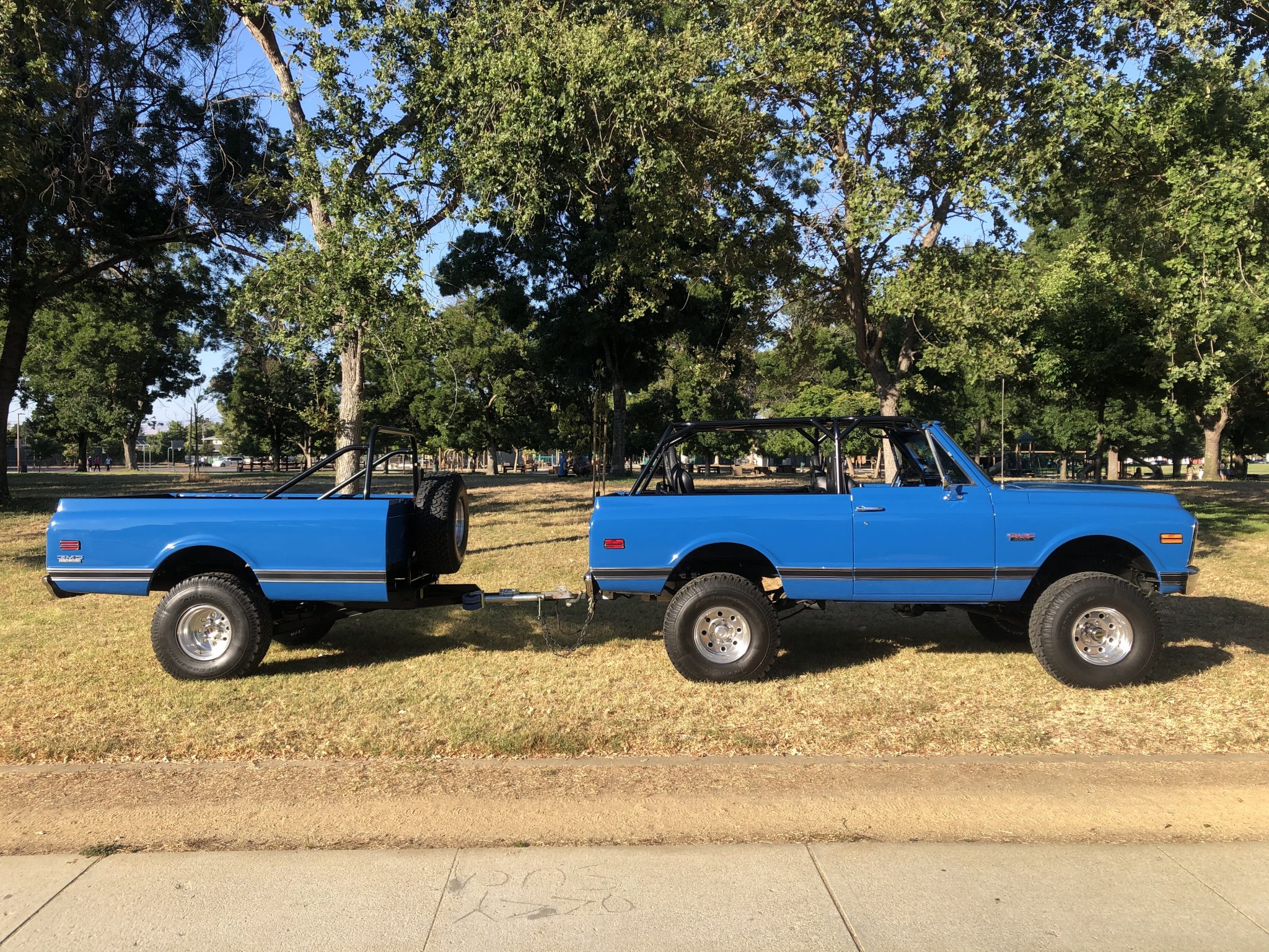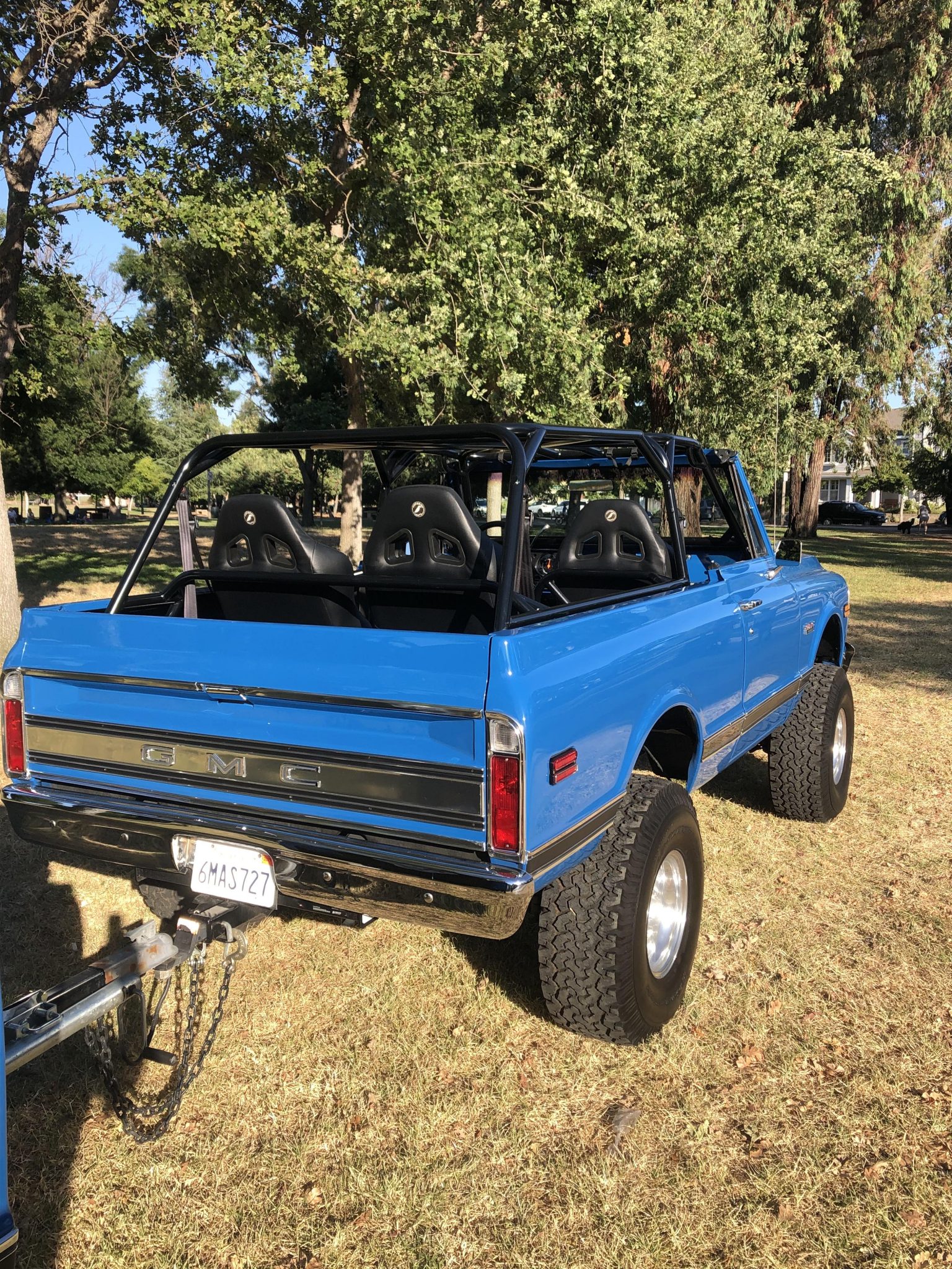 Polished Weld Super Single six-lug wheels are mounted over manually-locking hubs up front and wear BFGoodrich All-Terrain T/A KO tires, including on the included trailer. Moser axles are installed, along with a 6″ Skyjacker Softride lift kit. Braking is handled by front discs and rear drums.