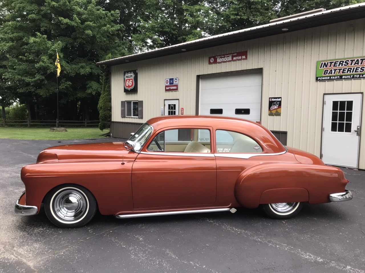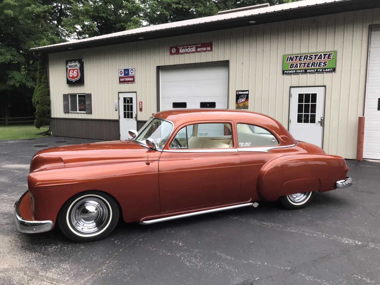 Steel wheels wear chrome hubcaps and whitewall tires. A full-size spare featuring a Dayton whitewall tire is fitted in the trunk.