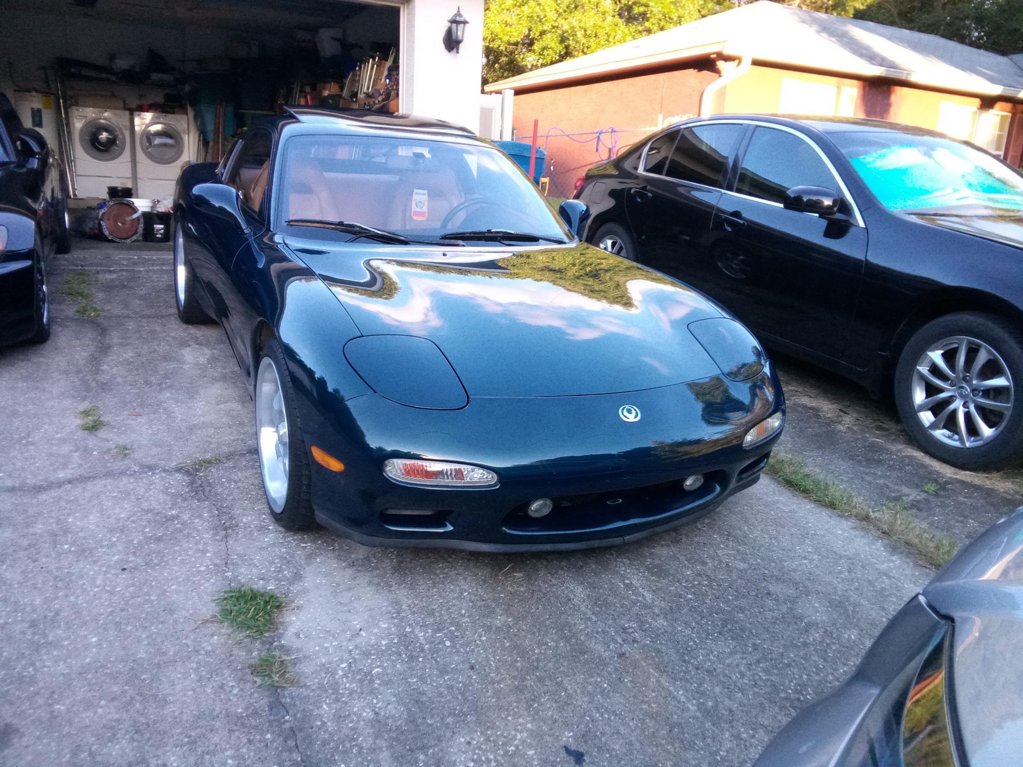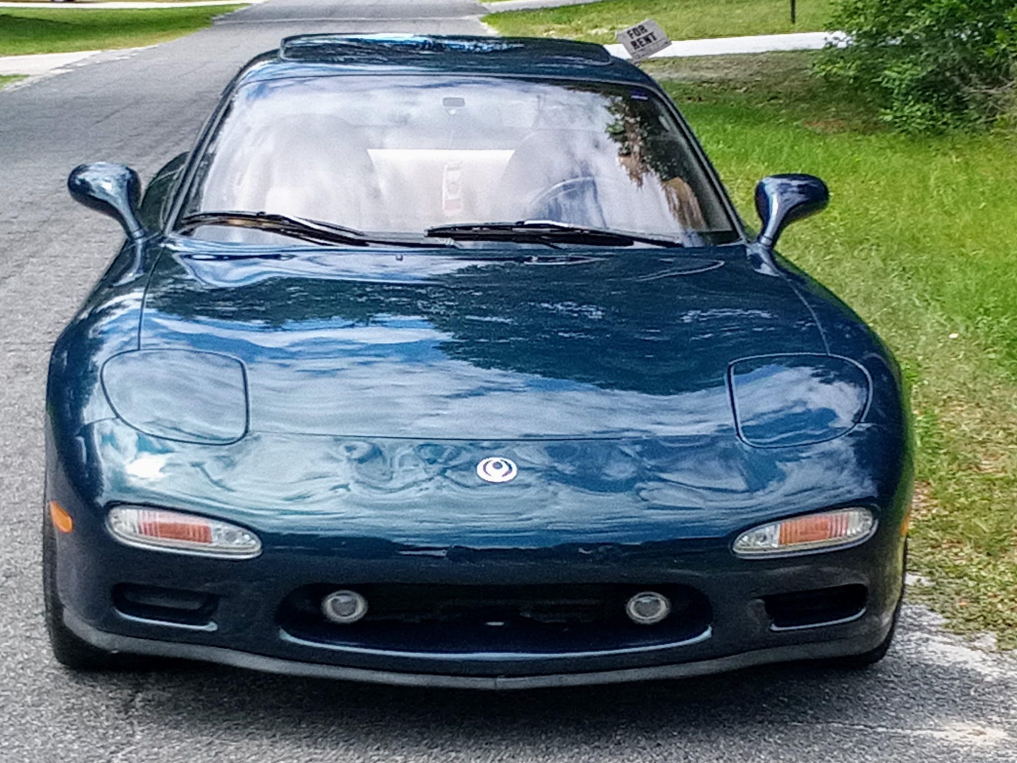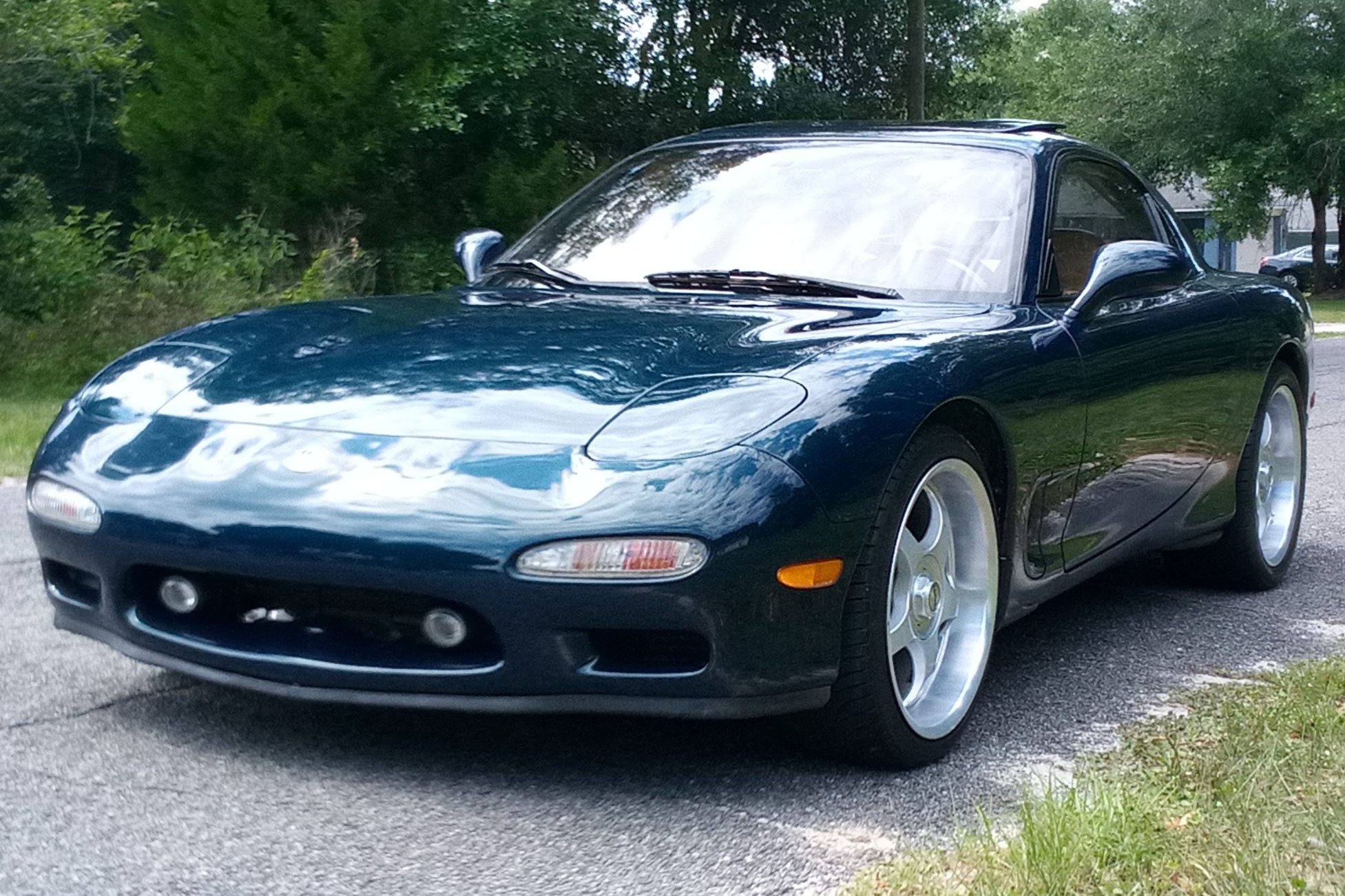 Borbet Design TD 18″ forged wheels are mounted with Sumitomo HTRZ III tires, which the seller notes are dry-rotted. The removed factory wheels are included in the sale. All third-generation RX-7s were fitted with four-piston front and two-piston rear brakes.