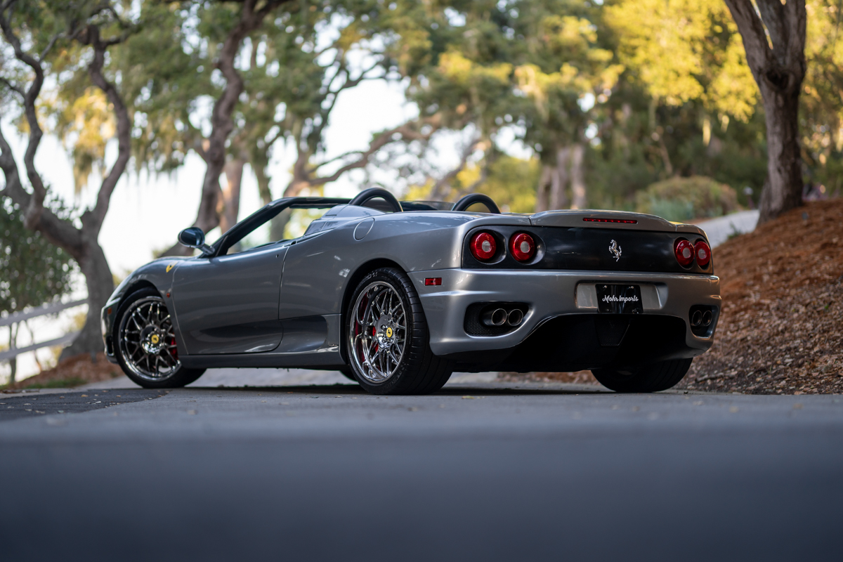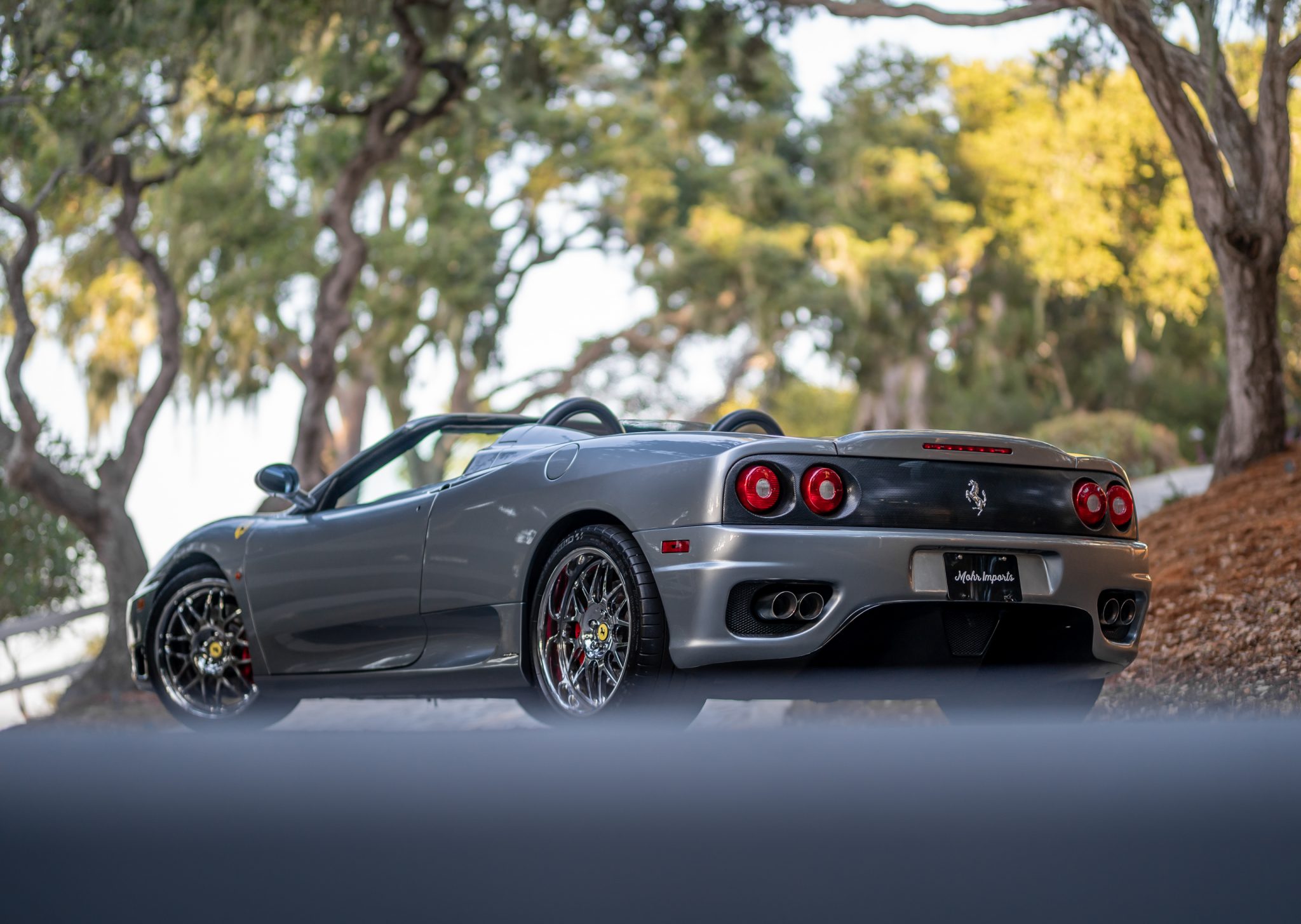 Aftermarket 19″ wheels feature yellow prancing-horse center caps and wear a mixed set of 235/35 front and 305/30 rear Michelin Pilot Sport Cup 2 and Pilot Super Sport tires. Braking is provided by red Ferrari-branded calipers and cross-drilled rotors at all four corners, and the pads and fluid were reportedly replaced in August 2016. The blue convertible top was serviced in March 2018 and is shown in its raised position above.