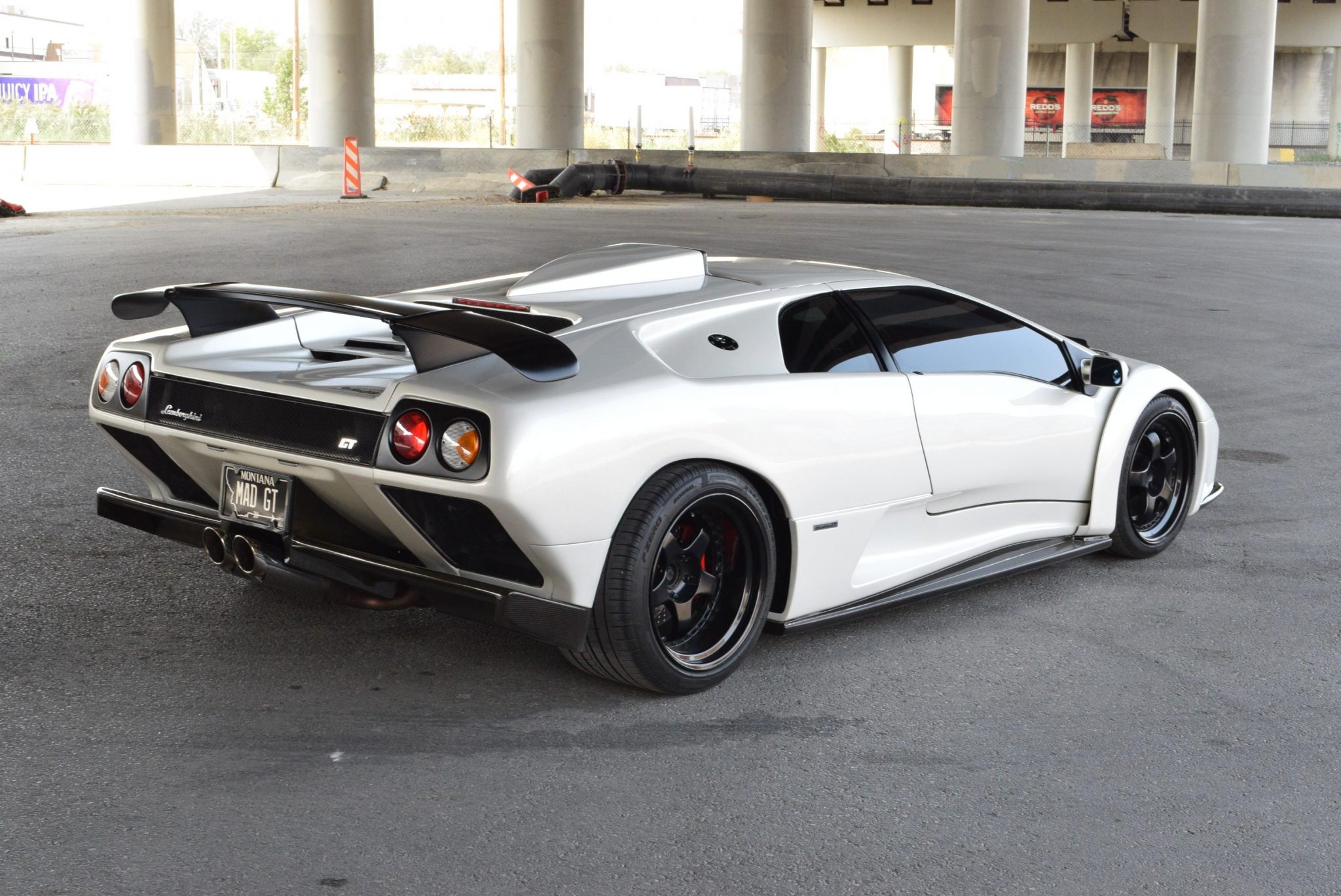 The fuel cap was moved to the top of the passenger quarter panel and a Tubi center-exit muffler fitted. Black staggered-width 18″ Work Meister S1 wheels wear Pirelli P Zero tires sized 245/35 up front and 335/30 out back. Red Lamborghini-branded brake calipers are mounted up front, while a Brembo rear big brake kit was installed under the seller’s ownership. Cross-drilled rotors are featured all around.