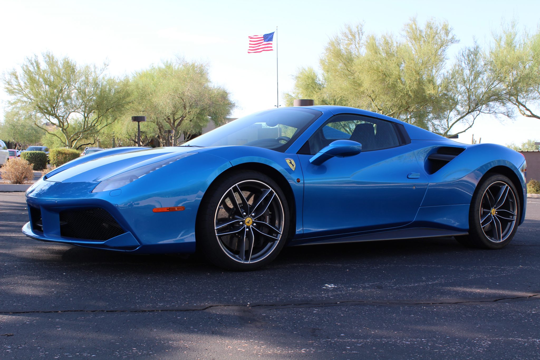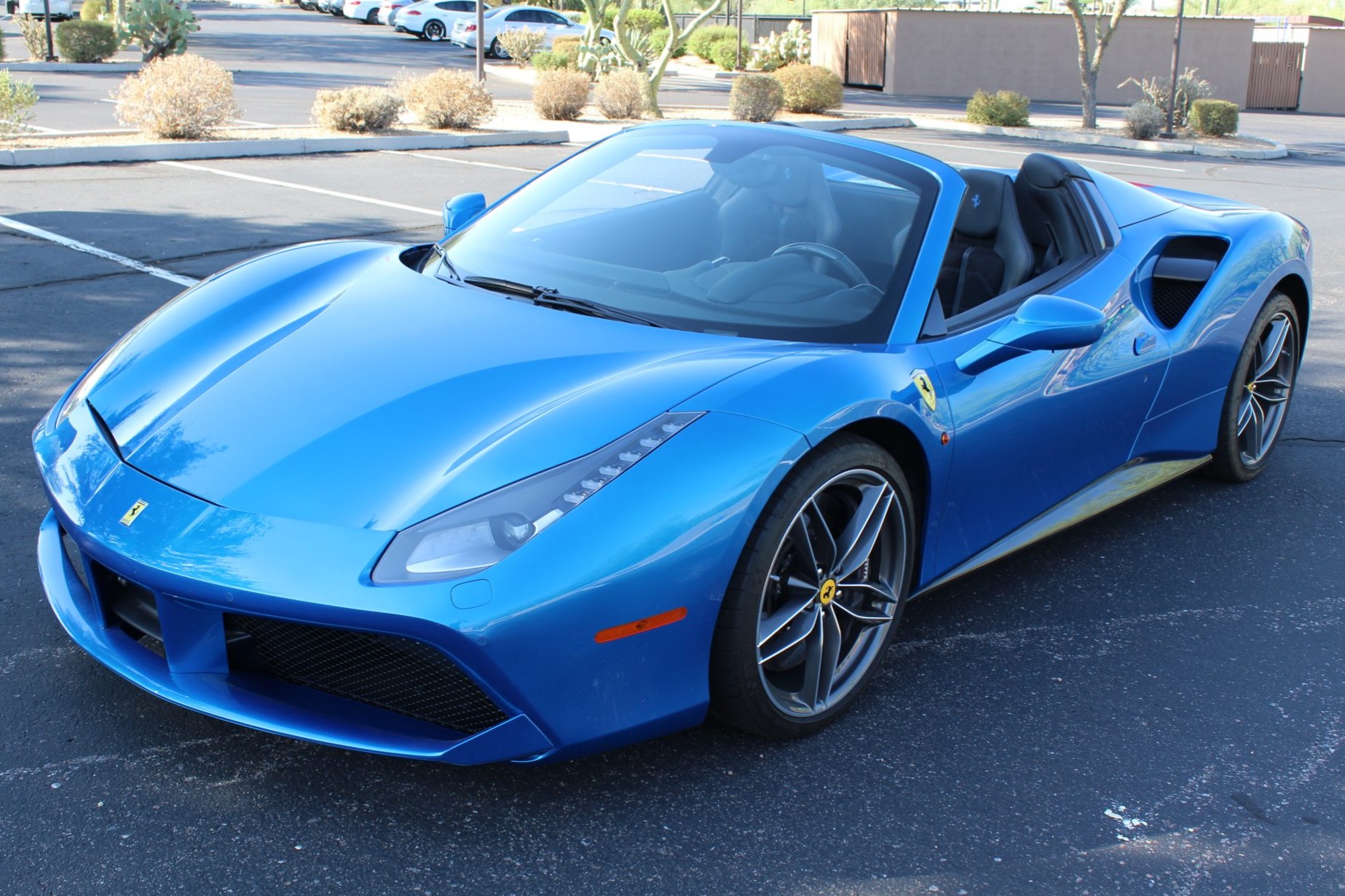 Stock 20″ wheels are mounted with replacement Michelin Pilot Super Sport K3 tires, with the rears showing 2019 date codes. Curb rash is noted on the left rear wheel. The car features an optional front suspension lifter, while the braking system utilizes carbon ceramic rotors paired with black calipers wearing Ferrari and Brembo lettering.