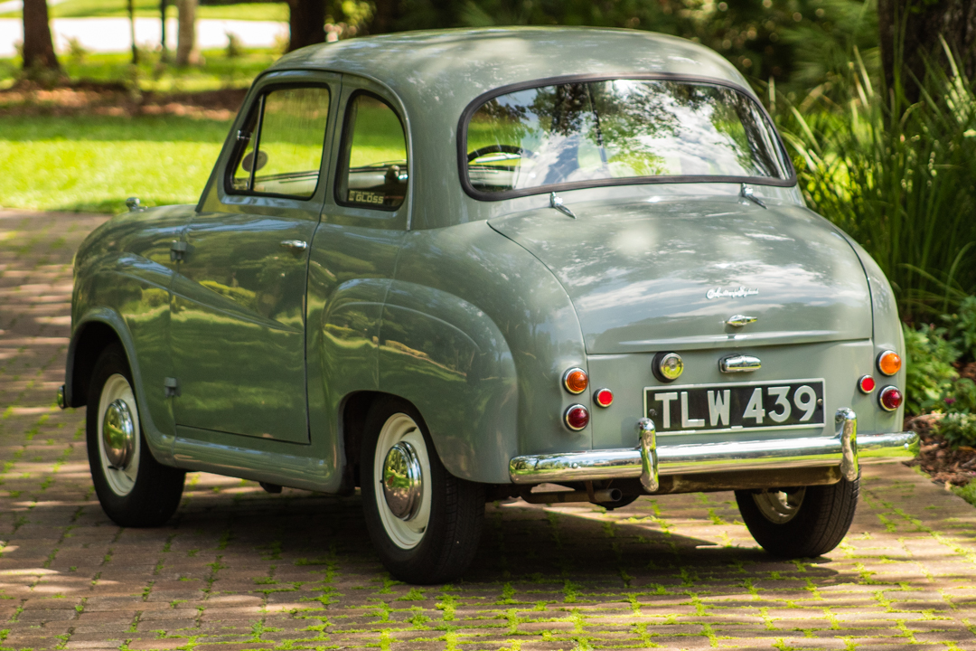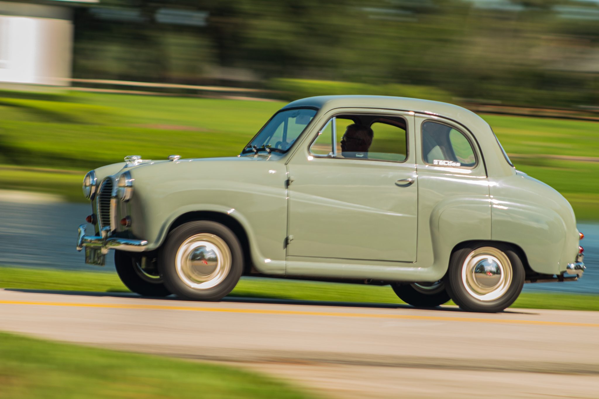 White-painted 13″ steel wheels with red pinstriping and chrome Austin hubcaps are wrapped in 155/80 Continental ContiEcoContact EP tires. Factory drum brakes are fitted at all four corners.