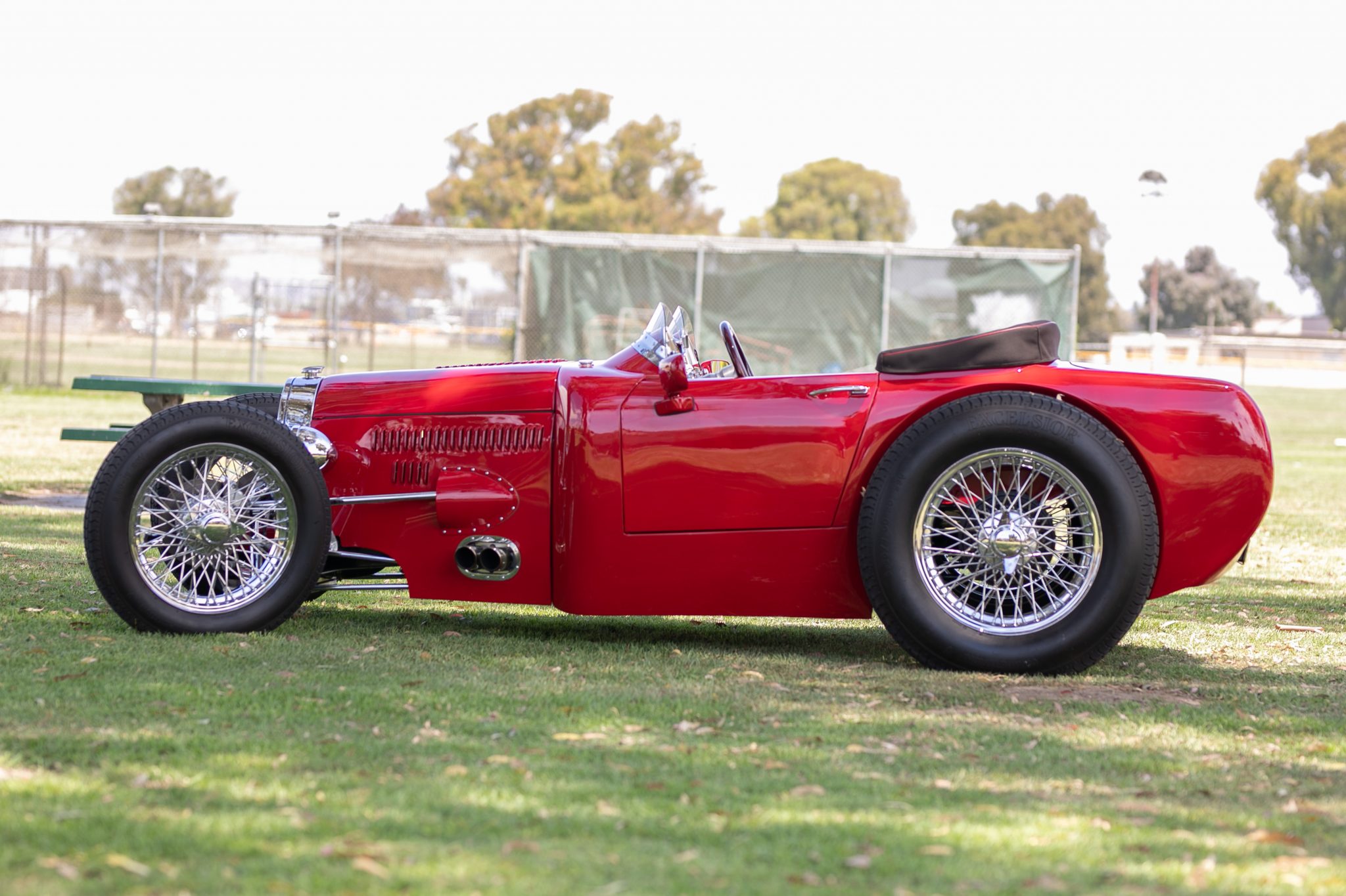 Chrome-finished wire knock-off wheels measuring 19″ up front and 20″ at the rear are wrapped in Excelsior Racing Competition tires measuring 5.5″ and 6.5″ wide, respectively. Disc brakes are fitted in front, with drum brakes at the rear.
