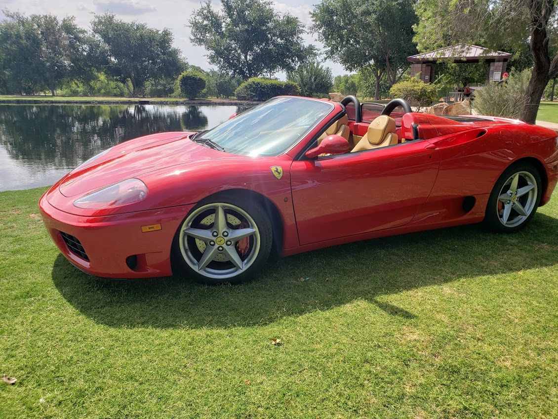 Factory 18″ five-spoke alloy wheels feature yellow Ferrari center caps and are wrapped in Continental ExtremeContact tires that were mounted in April 2019. The brake pads were also replaced at that time.