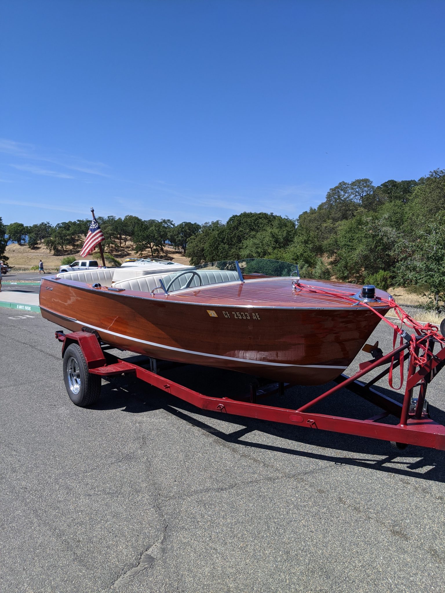 Details include a backdated bow light, a racing-style two-piece windscreen, bright rub rails, and dual exhaust exits at the waterline. The boat rests on a single-axle trailer featuring a manual winch as well as rollers and carpeted bunks. The seller states that the wheel bearings were repacked and new tires fitted in 2020.
