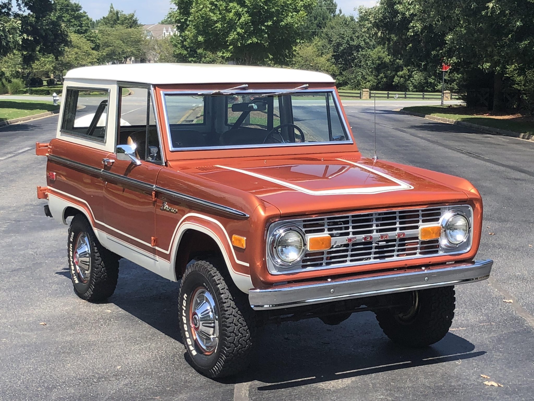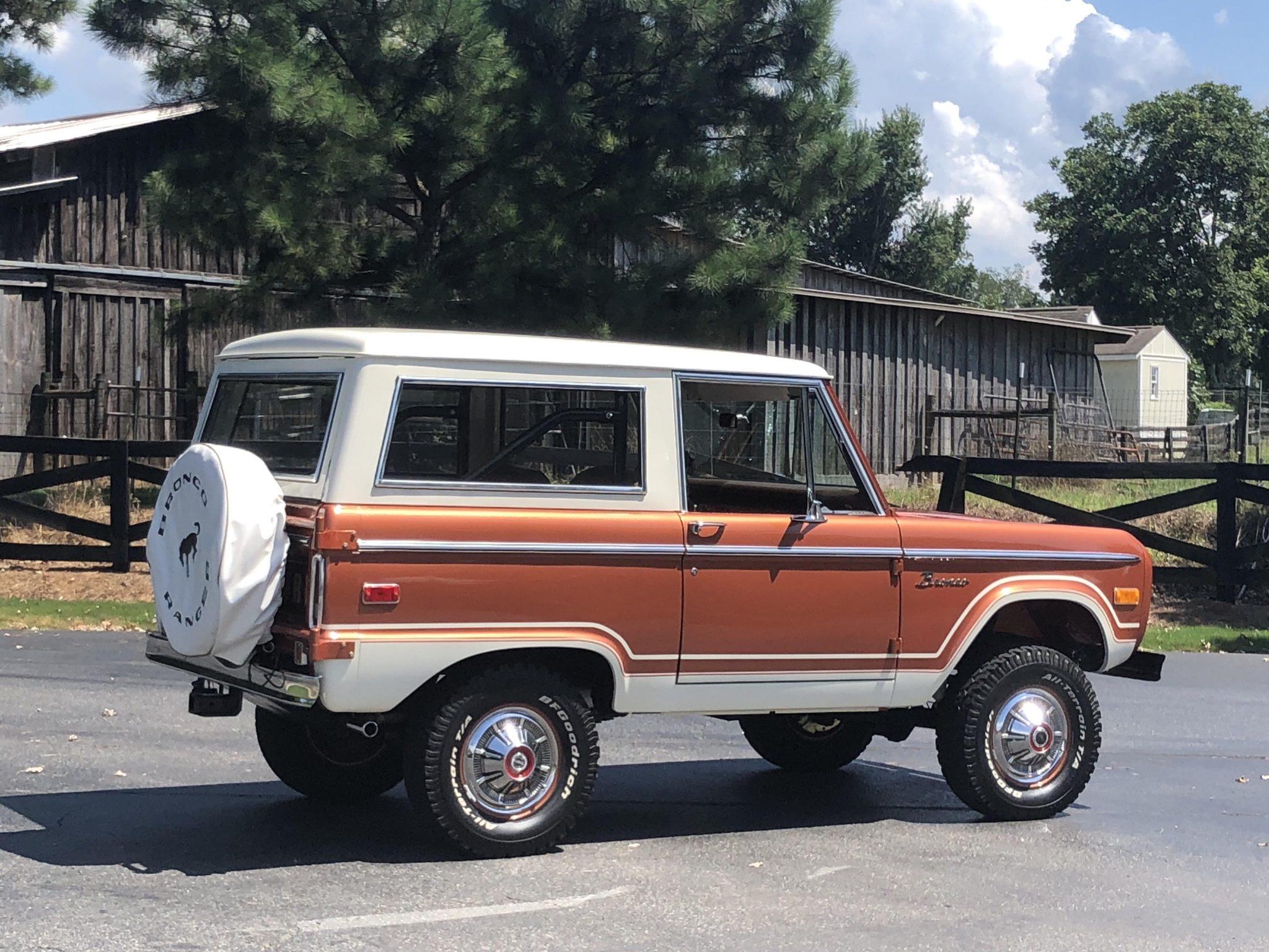 Body-color 15″ steel wheels with polished covers wear BFGoodrich All-Terrain T/A tires at all four corners. Factory equipment includes locking front hubs and power steering, while power-assisted brakes and a 2.5″ suspension lift kit have been added. A full-size spare is mounted on a swing-out carrier affixed to the rear tail gate.