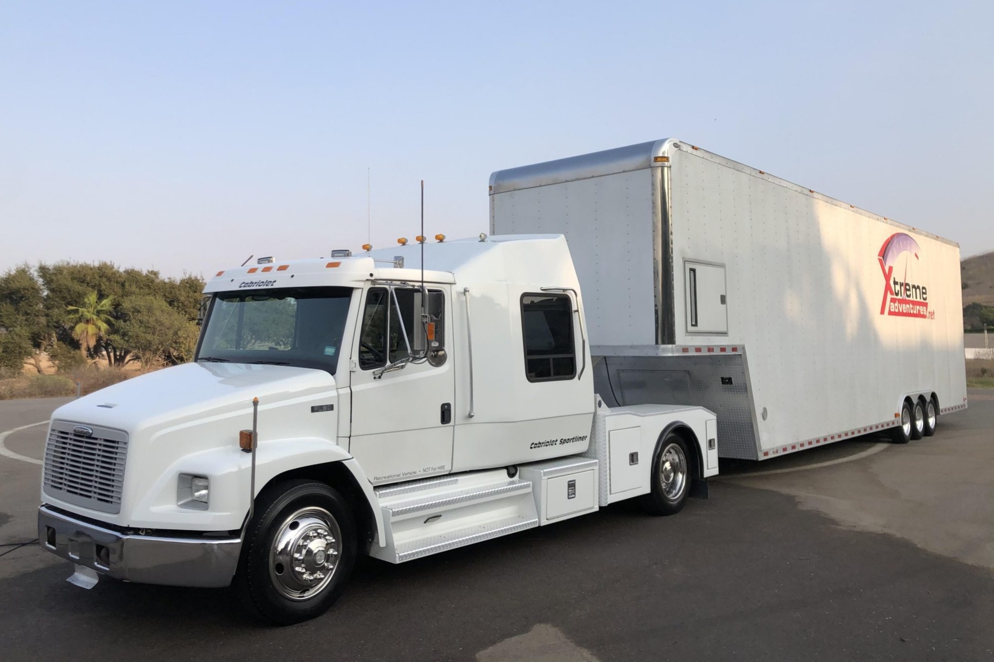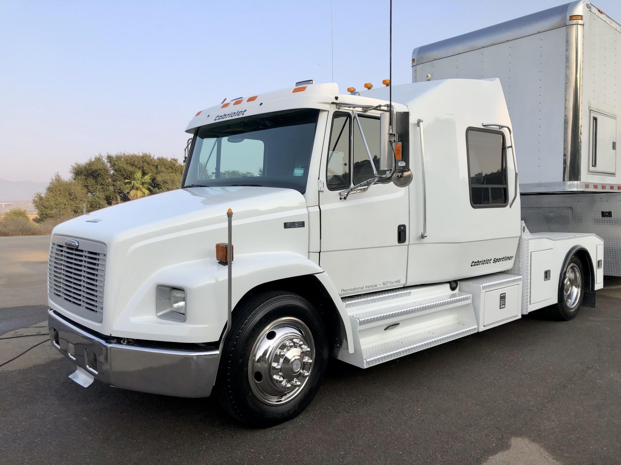 The Western-style bed is equipped with diamond-plate aluminum trim on the floor and rear bumper, along with dual aluminum belly cabinets with insulated doors. The 22.5” chrome wheels are wrapped in Yokohama RY023 tires sized 255/70. Towing equipment includes a gooseneck coupling and a rear-mounted receiver hitch, and the truck is equipped with air brakes. Recent maintenance reported by the seller included a brake service with the installation of a replacement PAC brake and front rotors.
