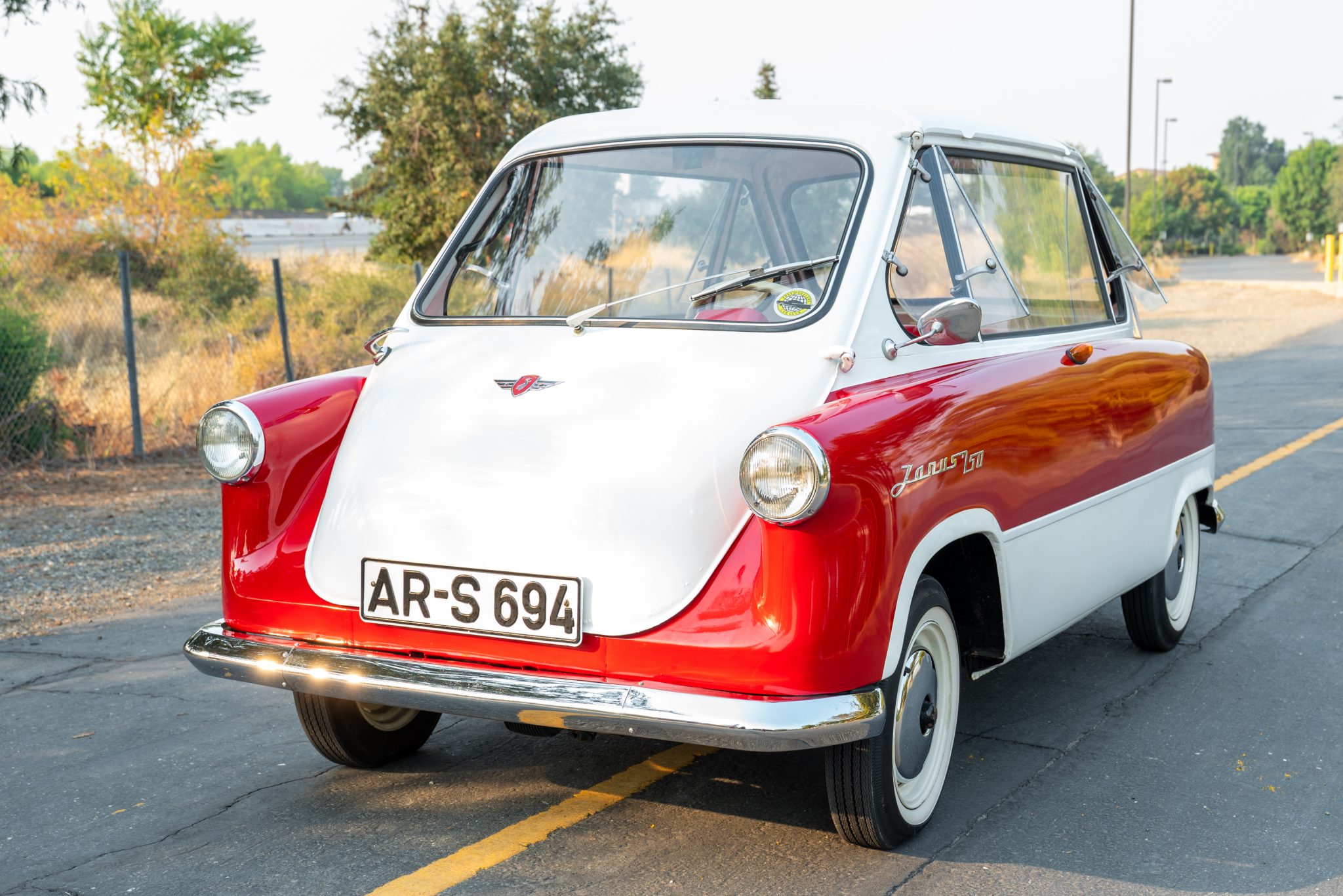 The white-painted 12” steel wheels wear chrome hubcaps and are wrapped in BFGoodrich Silvertown whitewall tires. Stopping power is provided by hydraulically-actuated four-wheel ventilated disc brakes, and the car rides on leading-arm front suspension with a swing-axle out back. A spare wheel is mounted in the floor between the seats.