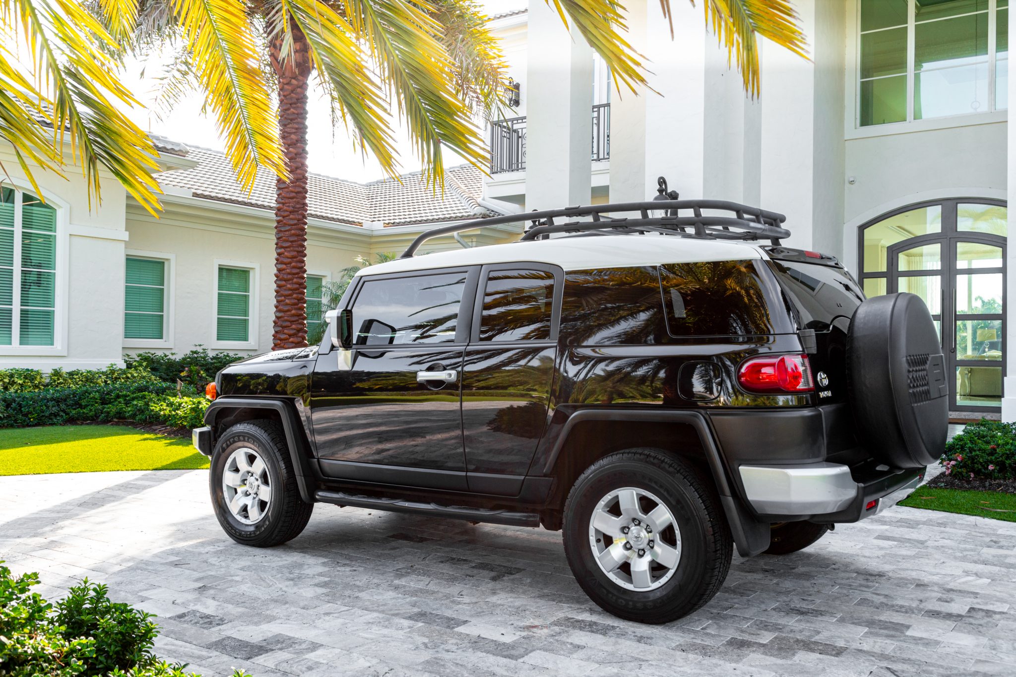 Six-spoke 17″ wheels are mounted with 265/70 Firestone Destination LE2 tires. A full-size spare is mounted to the rear door and is protected by an FJ logo plastic cover. The truck utilizes a control-arm front suspension design and a solid rear axle, and braking is handled by ventilated discs at all four corners.