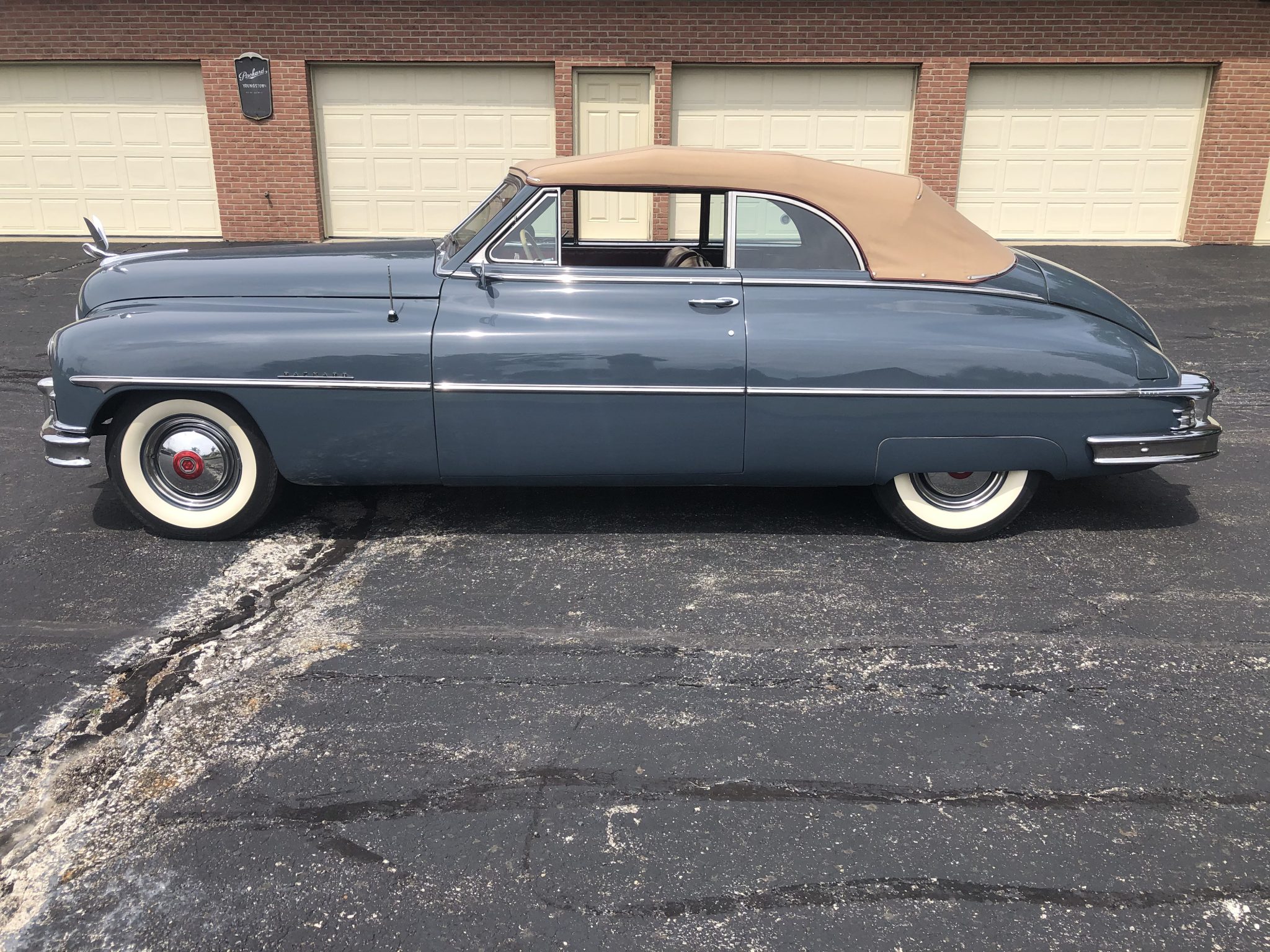 Stock body-color 15″ steel wheels wear Packard hubcaps, trim rings, and Remington wide whitewall tires. A matching spare is retained in the trunk. The power-operated tan convertible top is shown in the raised position above and is demonstrated in operation here.