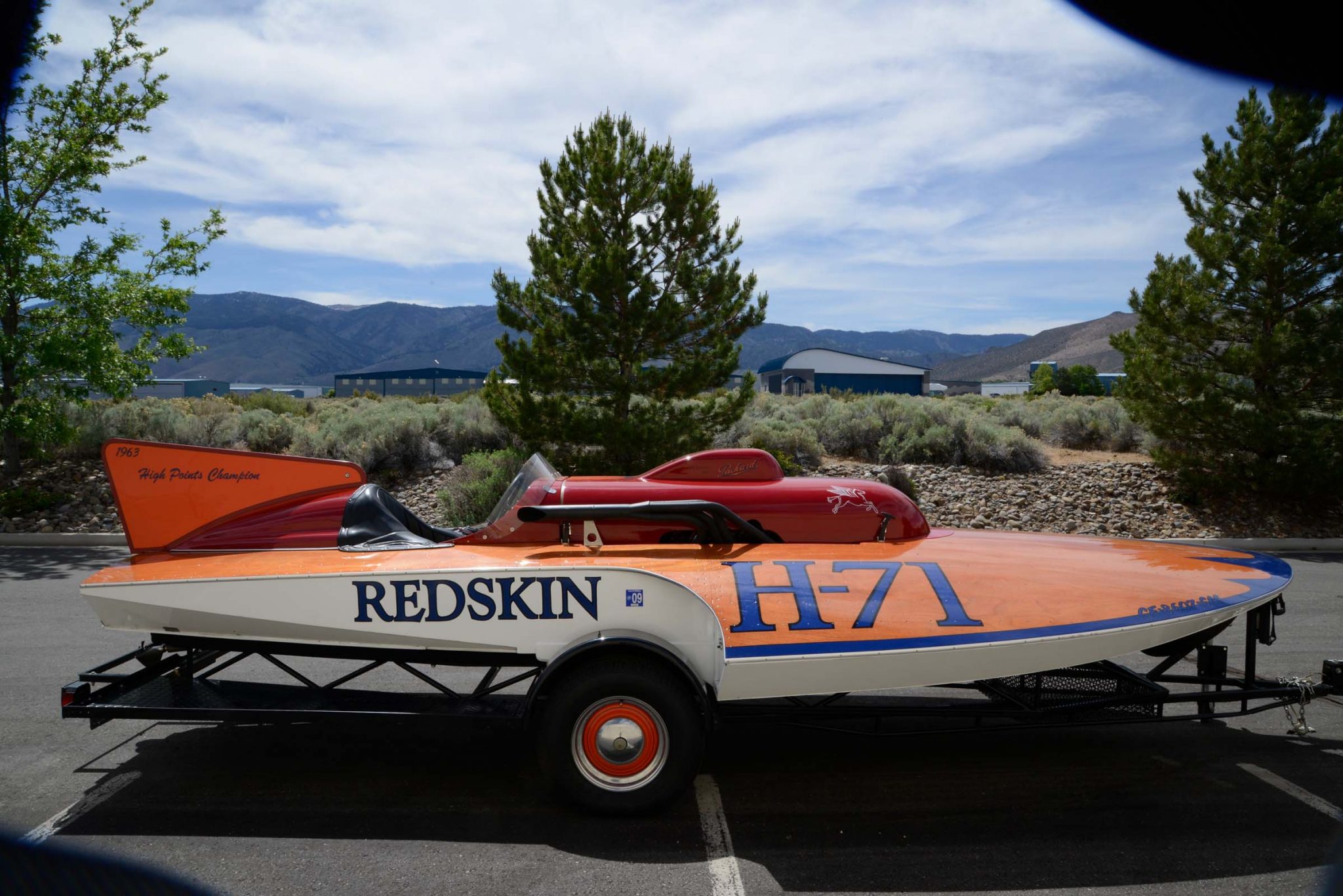 This hydroplane’s designer, Ted Jones, was inducted into the Motorsports Hall of Fame of America in 2003. The planning-style hull measures 22′ long and 8′ 10″ wide and is constructed of Honduran mahogany over oak framing. It has a varnished foredeck, blue trim, a red engine cover, and a vertical fin painted in red and orange. The vessel was restored in the 1990s by Marshall Mathews of Palo Alto, California.
