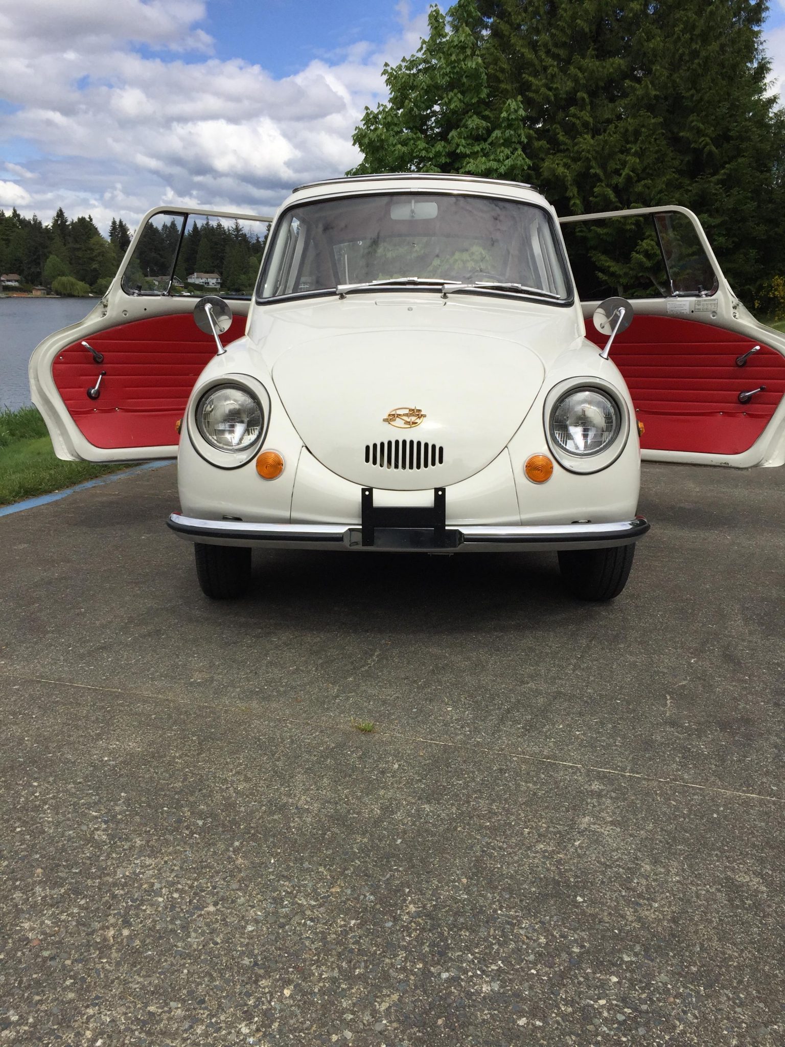 The car is equipped with rear-hinged doors, dual fender mirrors, and painted steel 10″ wheels that are bolted directly to the finned brake drums, which were turned and repainted red by the seller. The front wheel bearings are also said to have been replaced. 145/80 Kumho Power Star 758 tires are mounted at all four corners. A set of stock hubcaps is included in the sale.