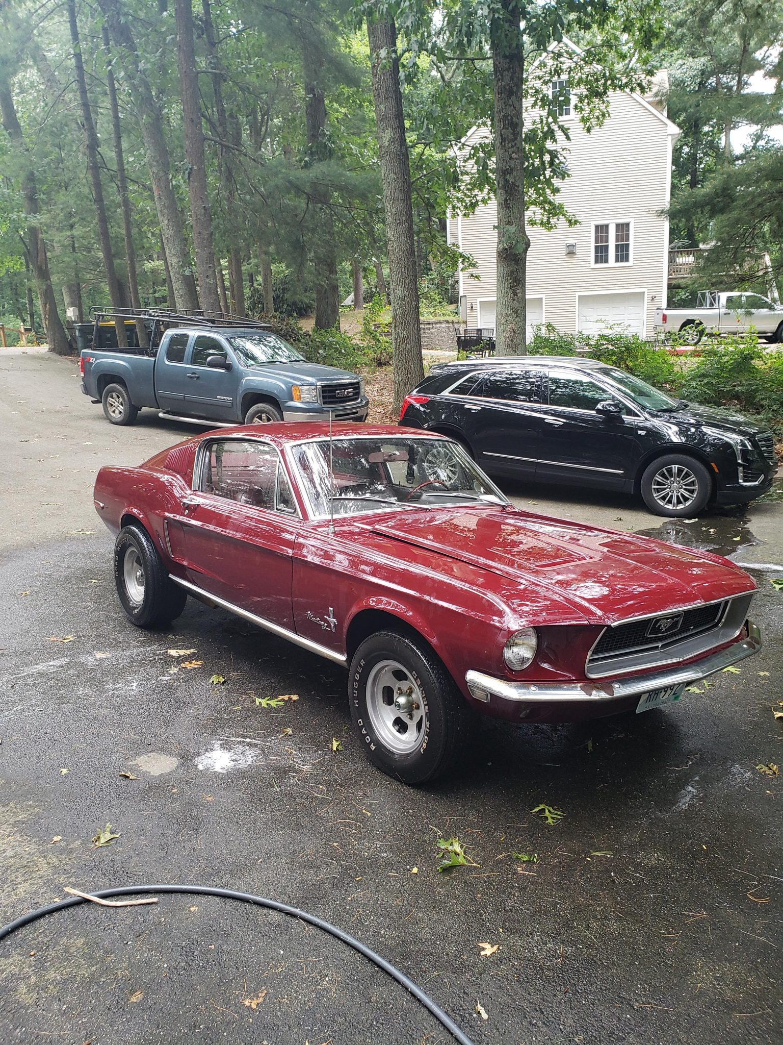 Aftermarket 14″ E-T slotted wheels wear F60-14 Road Hugger tires with raised white lettering. Track bars are installed, and drum brakes are equipped at all four corners.