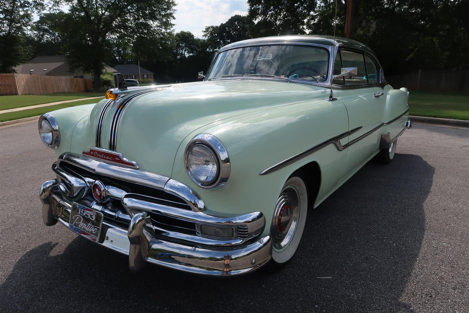 Body-color 15″ steel wheels feature full polished covers with red Pontiac logo center rings and wear 215/75 whitewall tires. This Chieftain features power steering and power brakes and reportedly received new shocks and suspension bushings during current ownership.