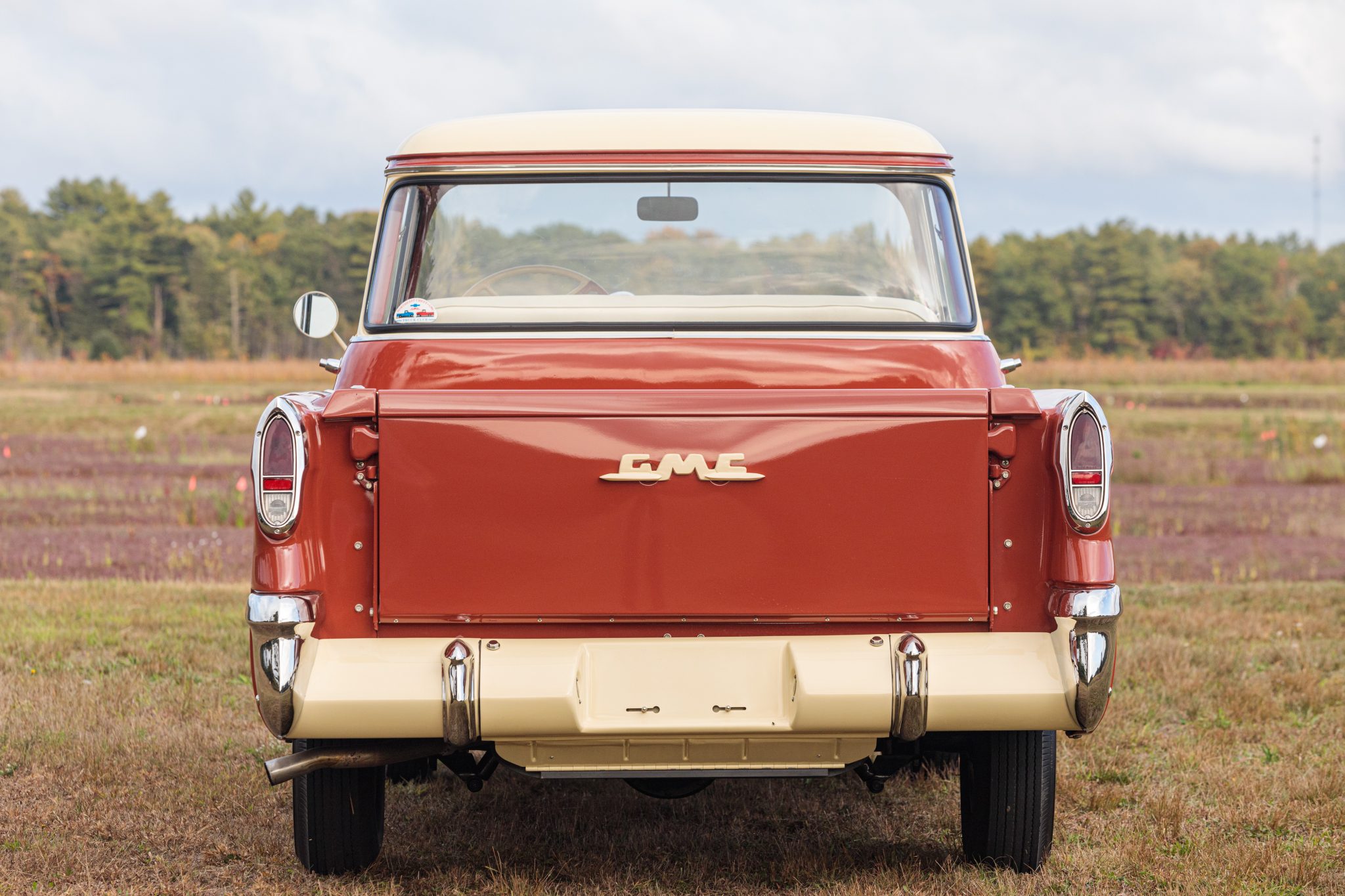 Cream-finished 15″ steel wheels wear GMC-branded hub caps, and BFGoodrich Silvertown whitewall tires. The cargo bed features wood slat flooring, cream runner strips, and cream interior bedsides.