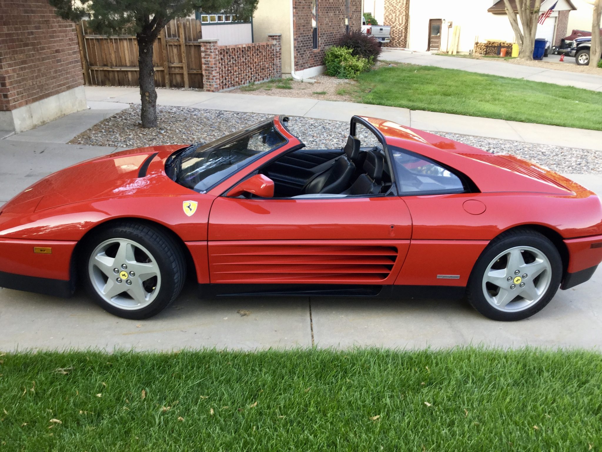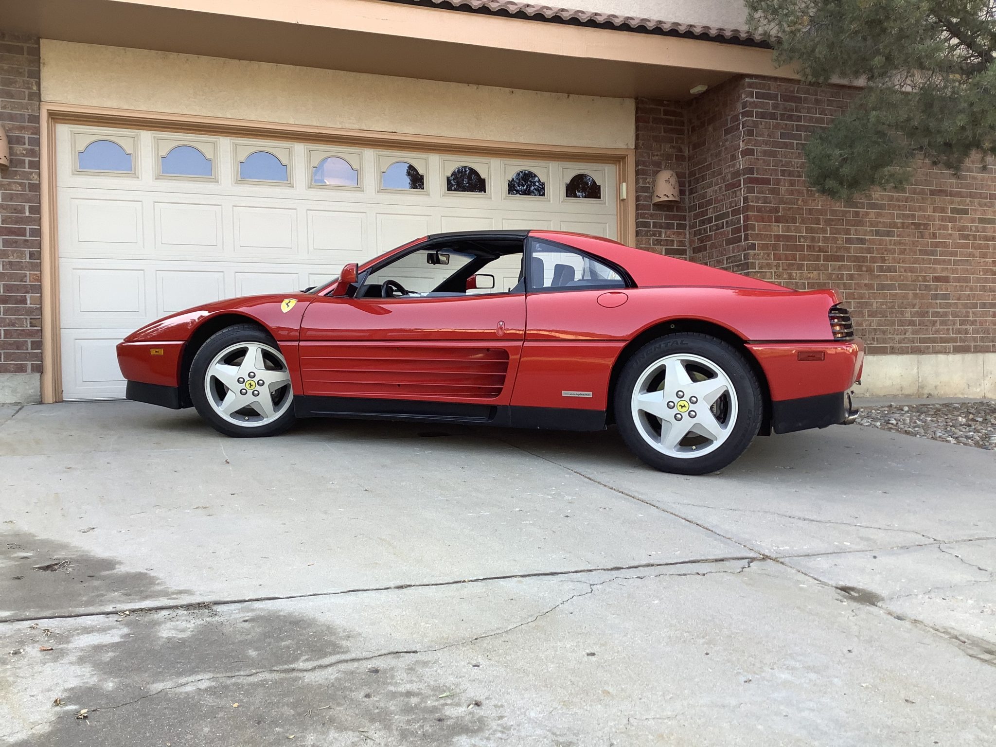 Factory 17″ five-spoke alloy wheels are mounted with Continental ExtremeContact DW Tuned tires. Braking is handled by Ferrari-branded calipers.