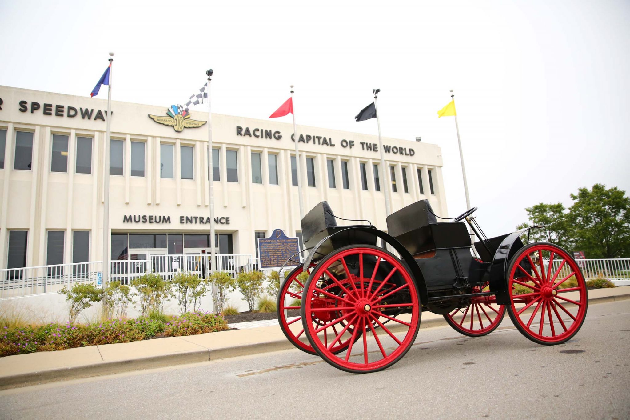 Red 16-spoke wood wheels are mounted with older solid rubber tires. The car is equipped with fully-elliptical leaf springs all around as well as dual mechanical rear brakes, the latter of which were adjusted in preparation for the sale.