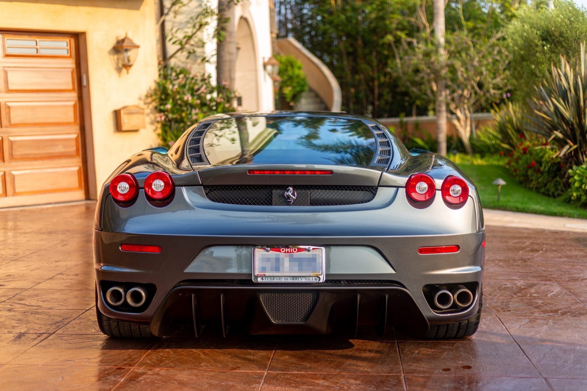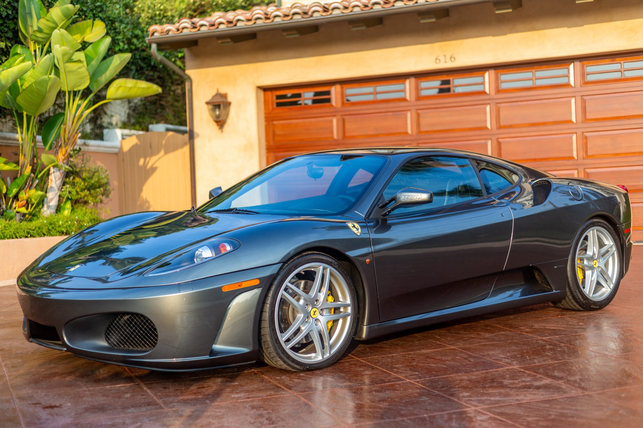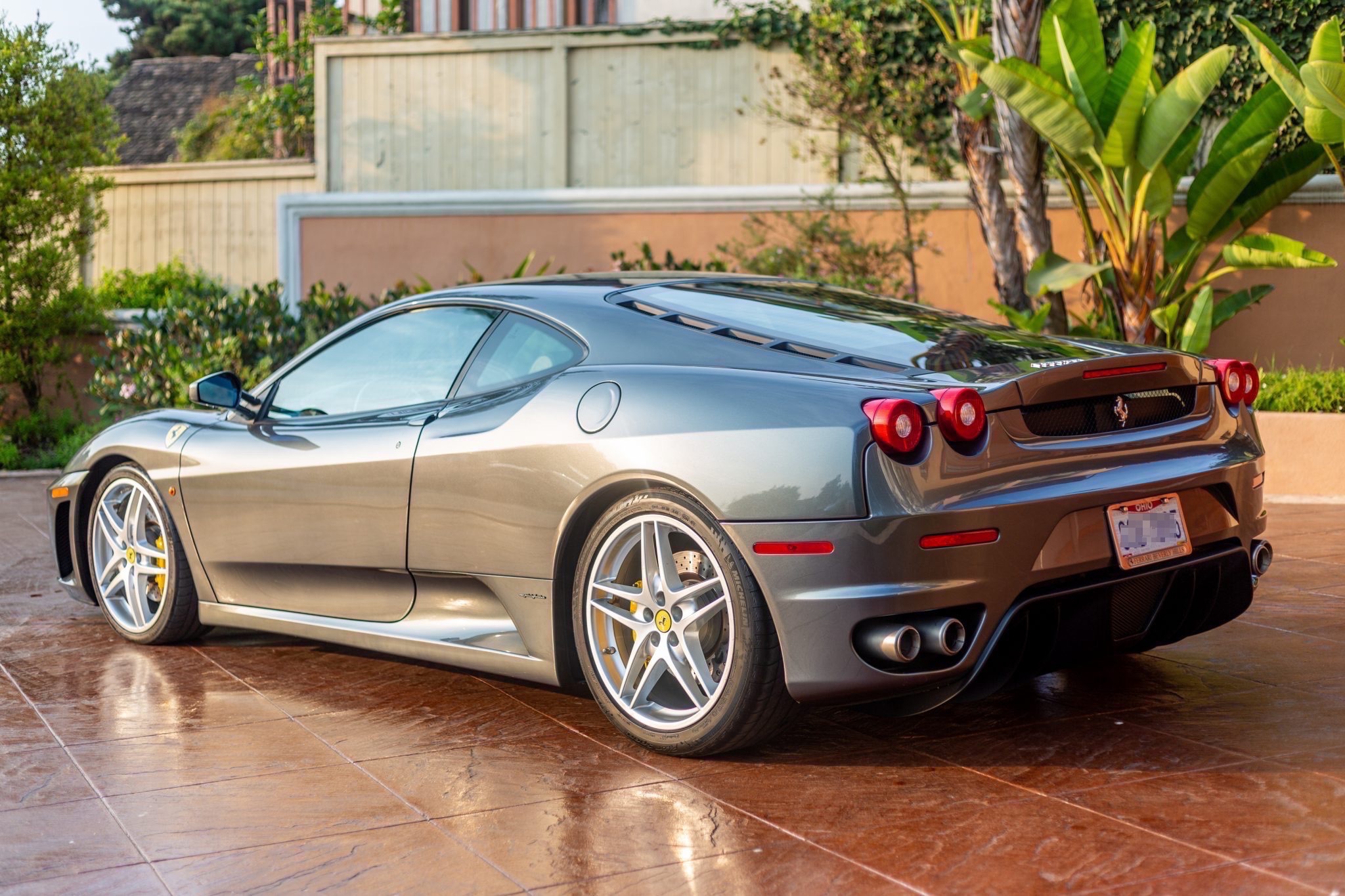 Factory 19″ split-spoke wheels are mounted with 225/35 and 285/35 Michelin Pilot Sport tires that show date codes from 2005 and 2008. The right rear wheel shows curb rash. Stopping power is provided by yellow Ferrari-branded Brembo brake calipers fitted over ventilated and cross-drilled rotors.
