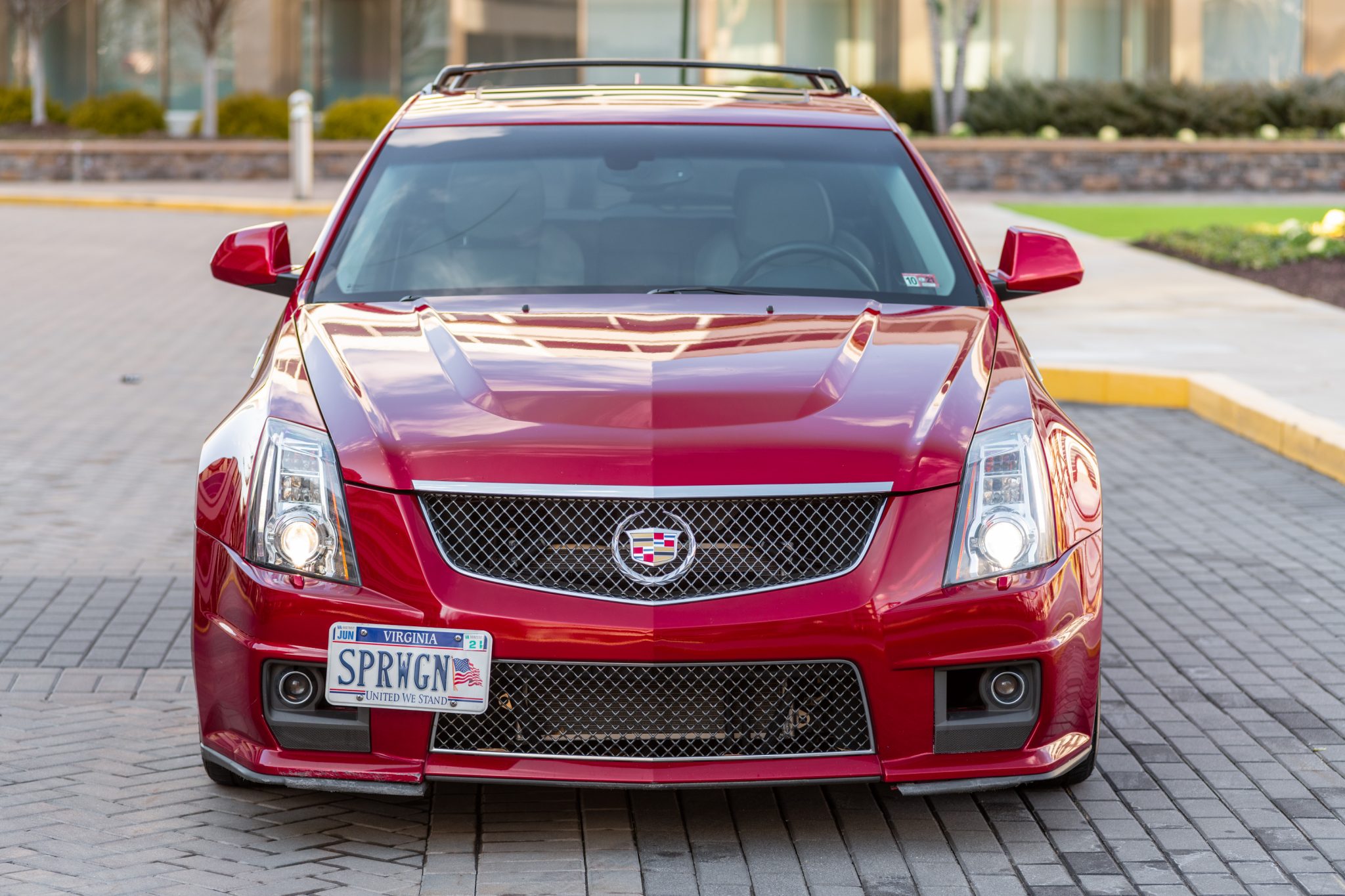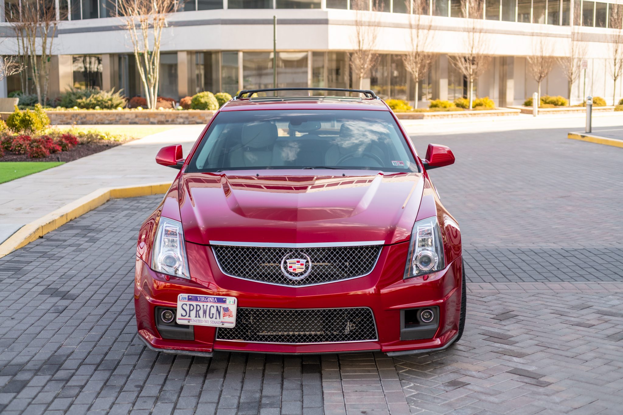 Black 19″ aluminum wheels are mounted with 255/40 Uniroyal Tiger Paw front and 285/35 Bridgestone Potenza S-04 Pole Position rear tires. The CTS-V utilizes an adaptive suspension system with magnetic dampers, and Eibach lowering springs have been installed. The rear shocks were replaced in 2017 followed by the front pair in 2020. The braking system features silver V-logo six- and four-piston brake calipers paired with cross-drilled and slotted rotors. Two additional sets of wheels are included in the sale.