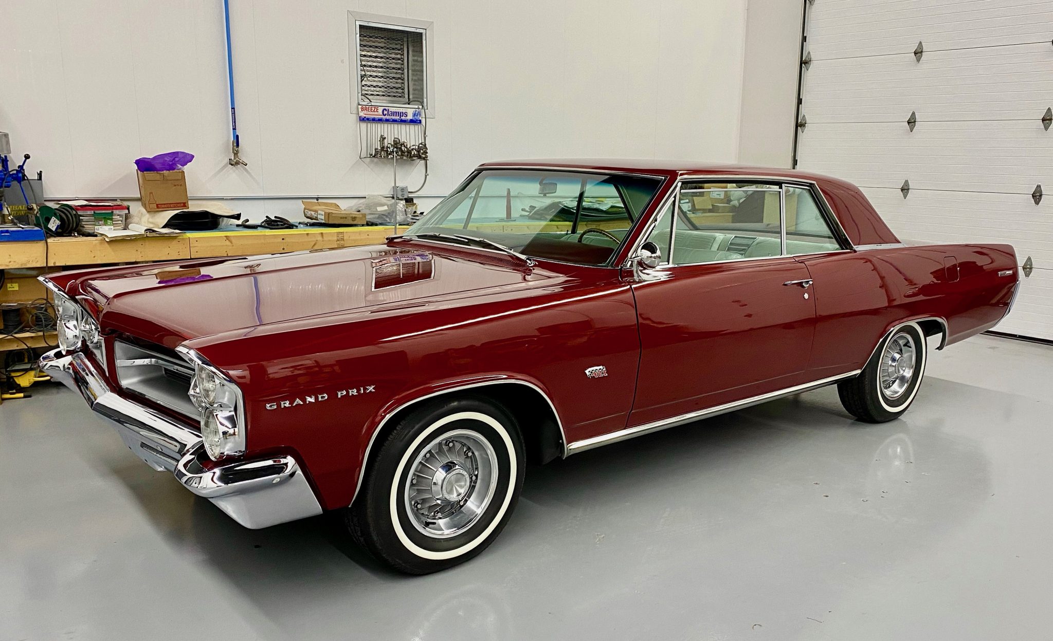 14″ eight-lug wheels wear chrome beauty rings and center caps as well as 235/75 Coker American Classic thin whitewall tires. Braking is handled by finned aluminum drums at all four corners that were reportedly refurbished by J&G Brake Drum Relining of McHenry, Illinois, and installed with replacement wheel cylinders, new wheel bearings, and stainless brake lines during the refurbishment completed in 2019. According to the seller, the frame was blasted and epoxy coated during the refurbishment, and the ball joints and shocks were replaced.