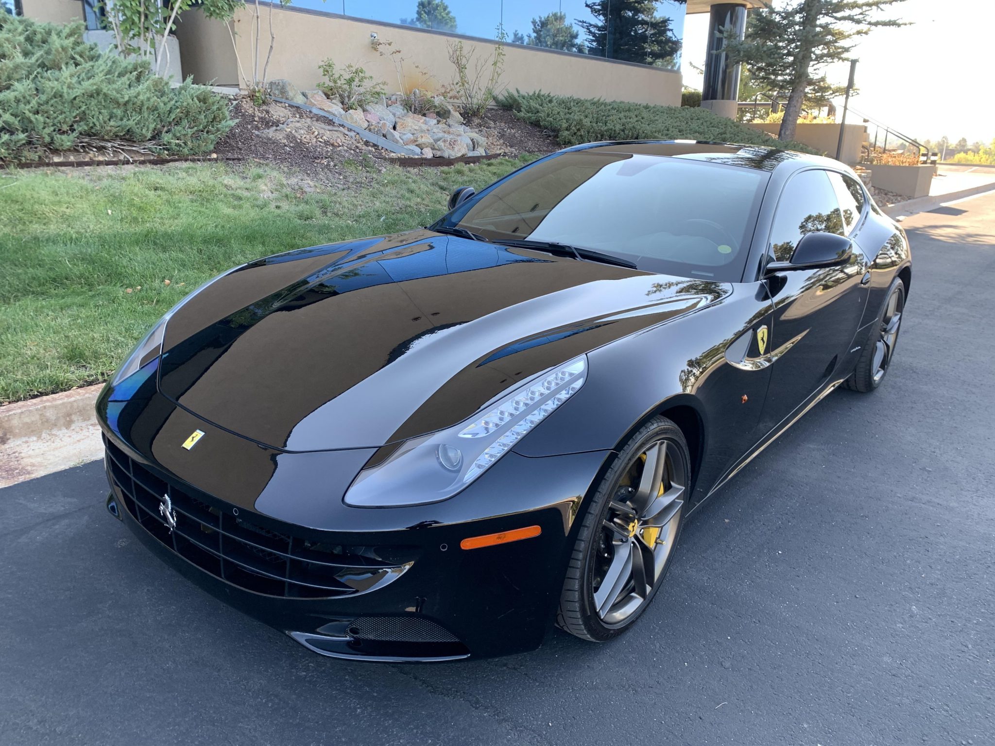 Staggered-width 20″ forged wheels wear yellow prancing-horse center caps as well as Bridgestone Potenza S001 tires. The rear tires were recently replaced. Braking is handled via yellow-finished six- and four-piston calipers paired with cross-drilled carbon-ceramic rotors.