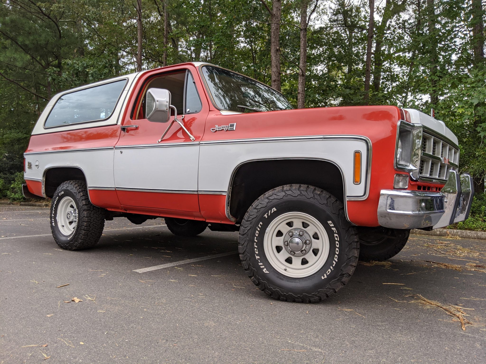 White-painted 15″ General Motors PA6 Sport steel wagon wheels wear BFGoodrich All-Terrain T/A KO2 tires that measure 31″x10.5″ and are said to have been installed in January 2019. A stock spare wheel is mounted in the cargo area, and the sale includes four stock steel wheels wearing older BFGoodrich tires, as well as a set of dog dish hubcaps and full wheel covers. The power steering pump was replaced and the steering box adjusted in January 2019.