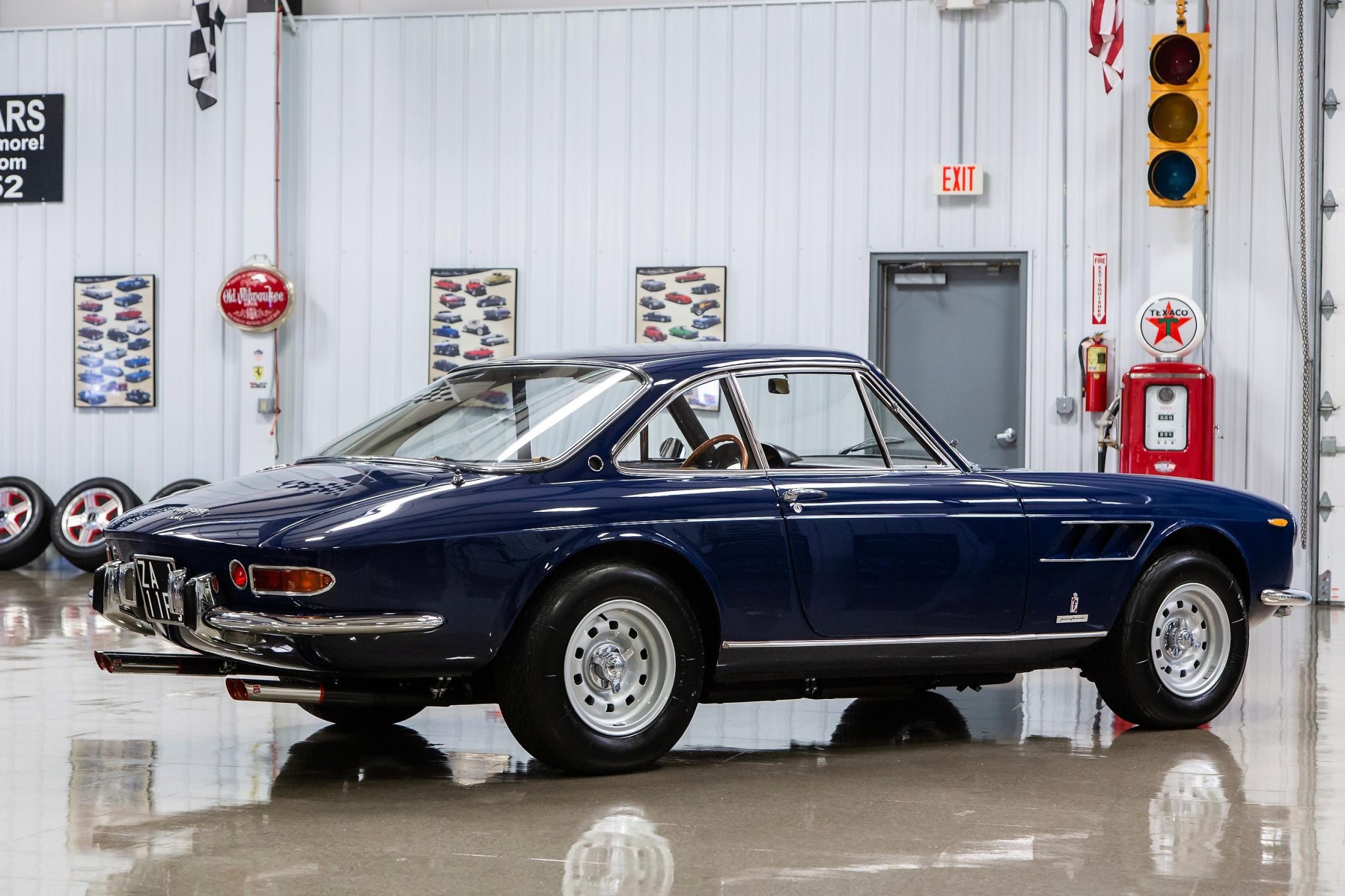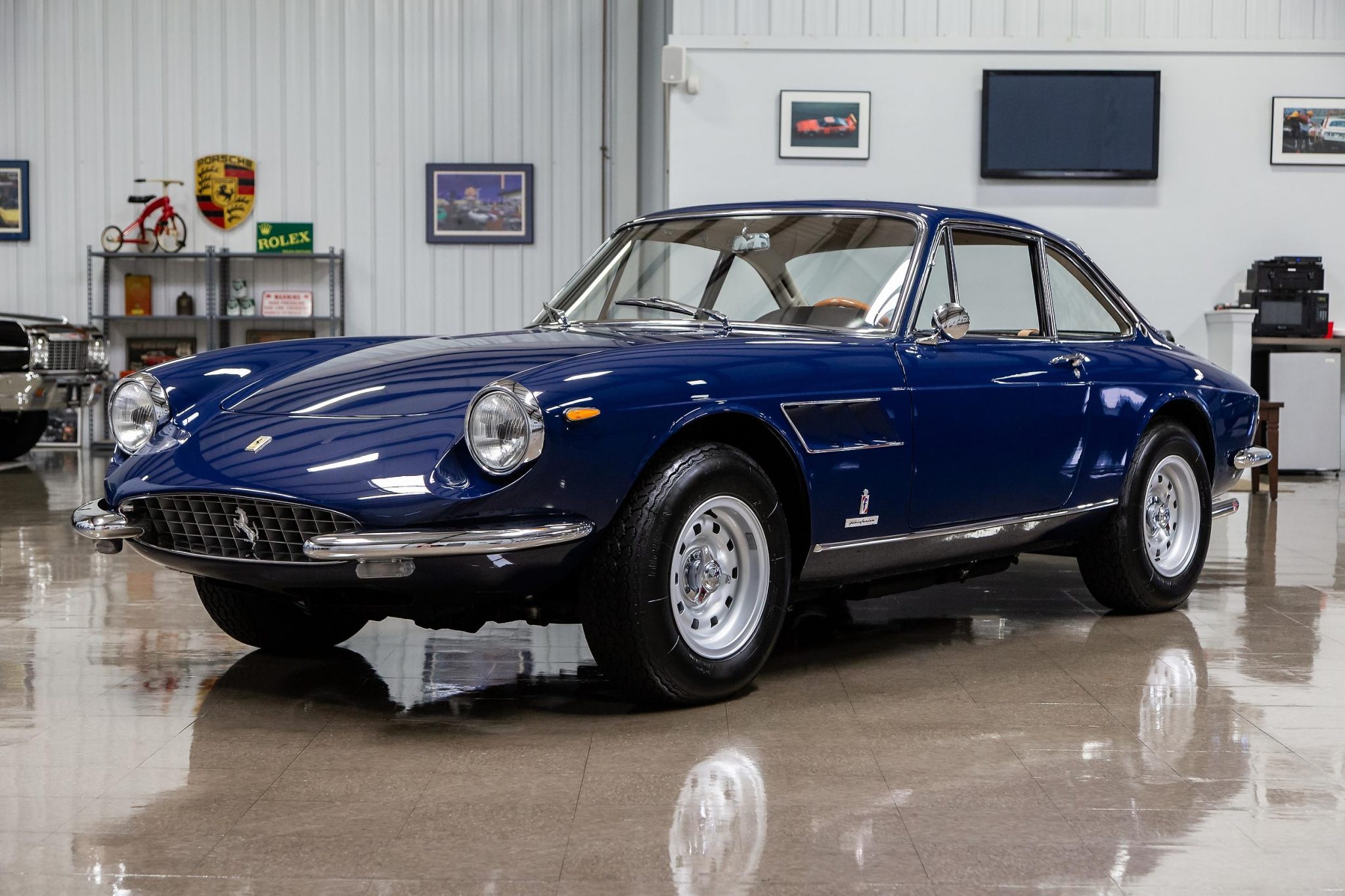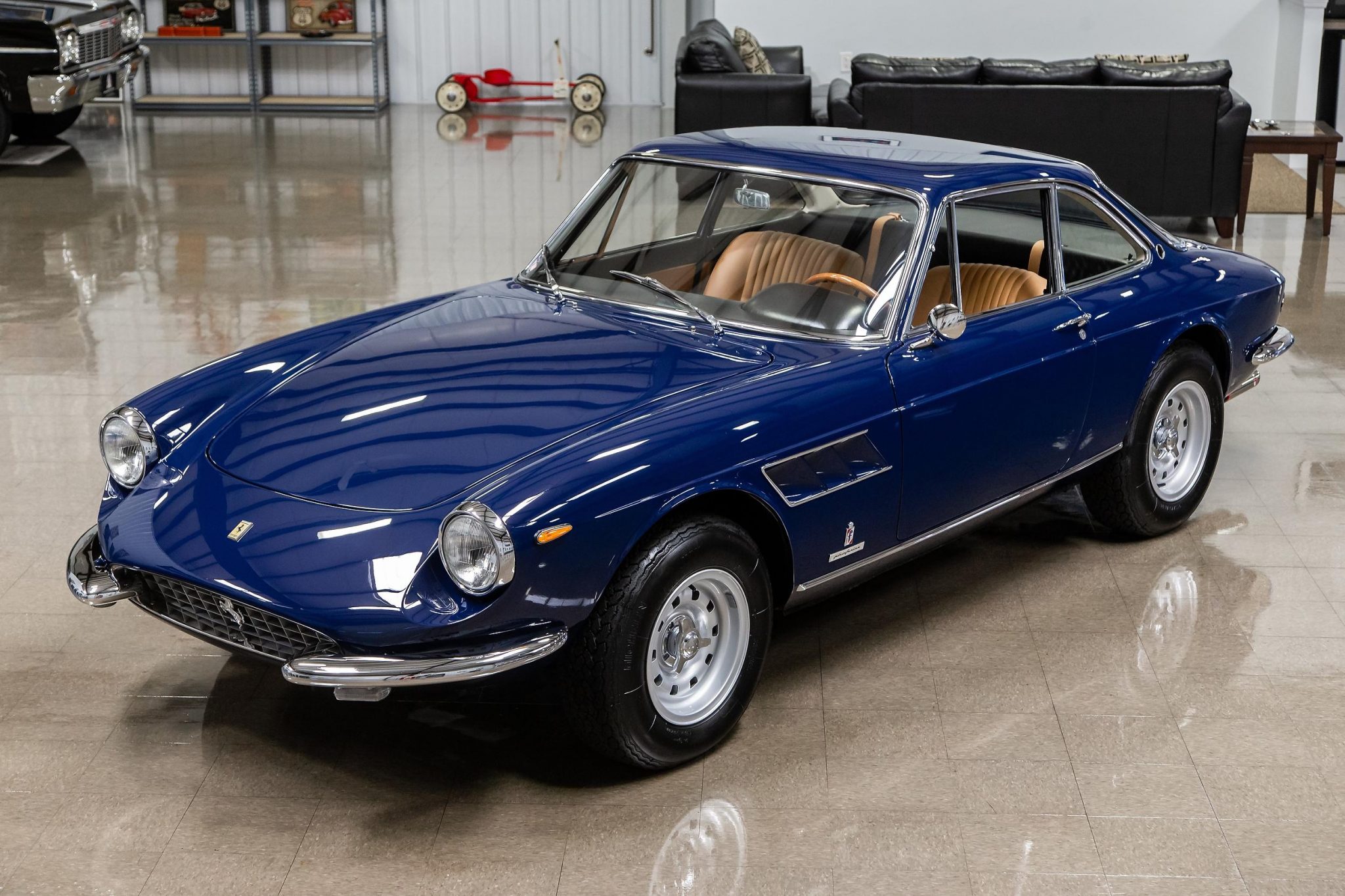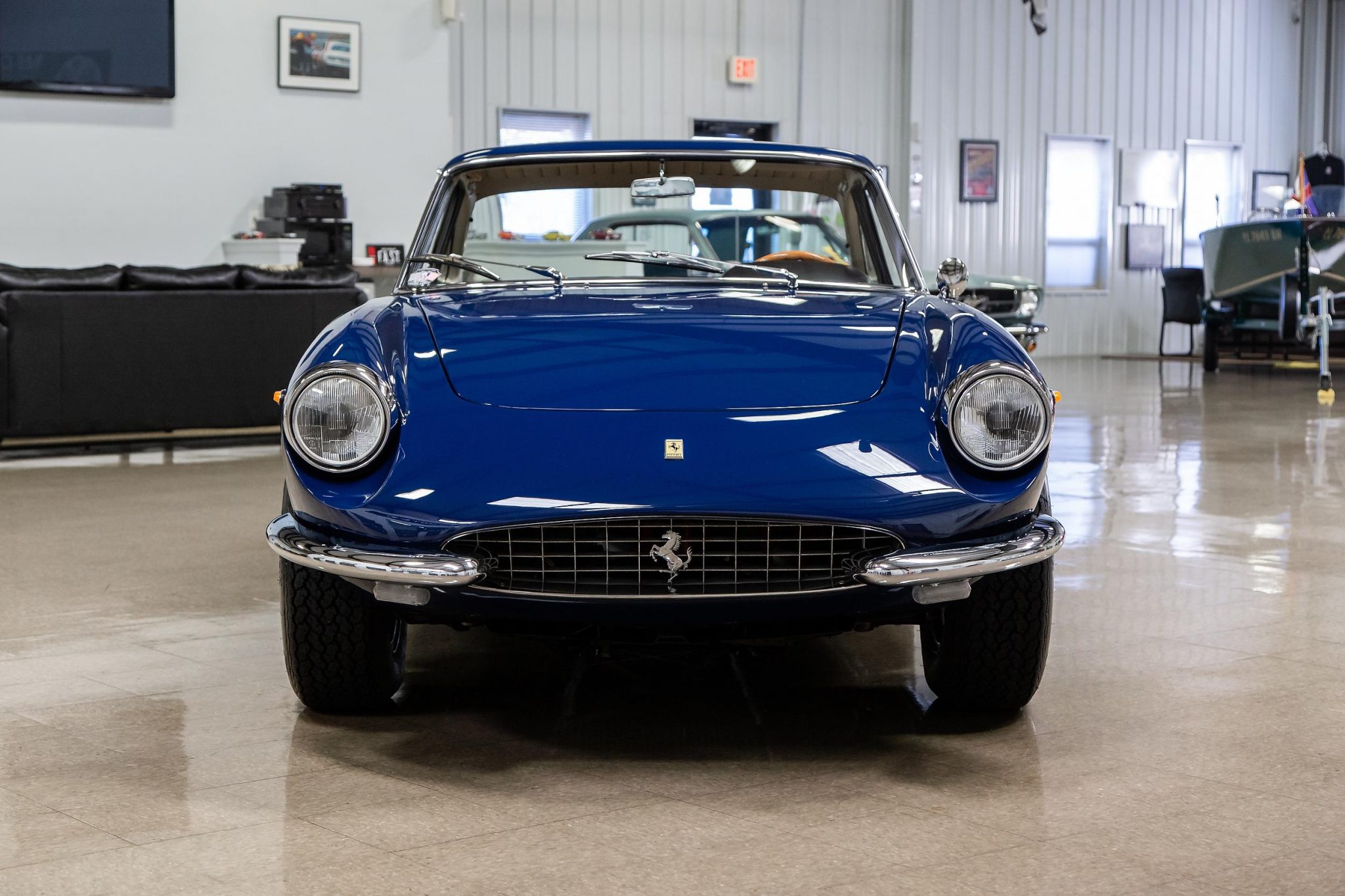 This example was reportedly refinished in its factory Bleu (19391) in 2007 by Carrozzeria Fantuzzi of Modena, Italy. The windshield and rear window are said to have been replaced at an unknown point in the past. Additional work in May of 2013 included re-plating various trim pieces, repainting both rocker panels, and refinishing the trunk and rear panel, all of which is outlined on an invoice pictured in the gallery below. The vehicle subsequently earned a Platinum Award from the Ferrari Club of America at the 2014 Concorso Ferrari in Pasadena, California.