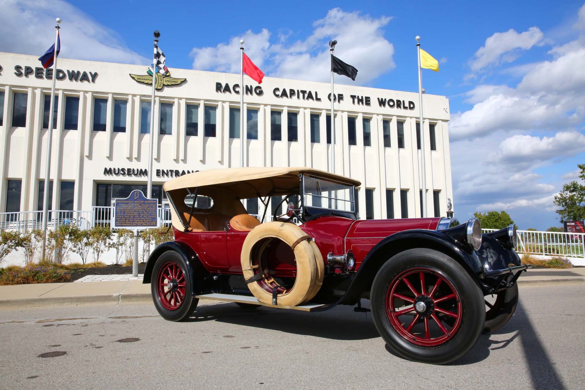 The car features a 132″ wheelbase and rides on body-colored wood-spoke wheels wearing 35×5 bias-ply rubber from Gehrig Tire Company. Two matching spare rims with covered tires are mounted on the passenger-side running board. Braking is handled by mechanically-operated rear drums. The chrome has rubbed off on the right side of the radiator shell and staining is noted on the tan soft top.