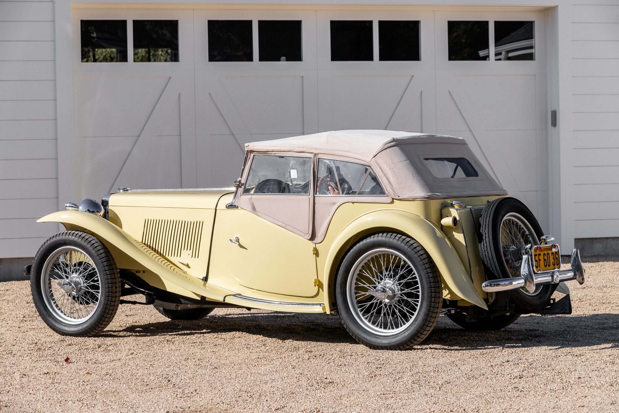 Painted 19″ wire wheels are equipped with two-eared knock-off spinners and are mounted with Ensign Triple tires that were reportedly installed in September 2020. Braking is handled by drum brakes at all four corners, and the car is equipped with a live-axle suspension with semi-elliptical leaf springs. The brakes were inspected and the rear brakes adjusted in October 2020 per the seller.